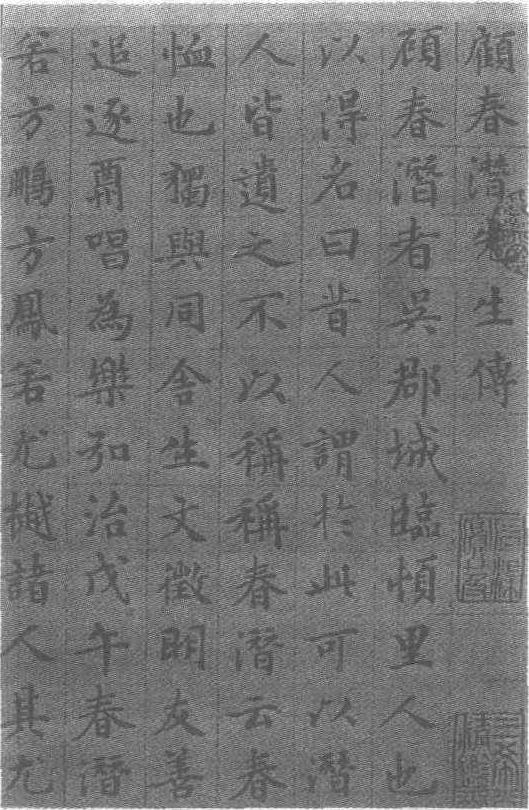 | 释义 | 文徵明楷书顾春潜传轴明。纸本。纵118.8厘米,横49.7厘米。上海博物馆藏。文徵明(见《文徵明行草书西苑诗卷》条目)书。此轴首尾计1000余字,写于嘉靖二十一年(即公元1542年),文氏时年73岁高龄。是晚年归田后作品。楷书齐整地写于鸟丝格内,采用“纵有行,横有列”的布局,结体方正宽博平稳,既有晋人古雅舒和的气韵,又融入了赵孟頫姿媚秀丽的特点,给以整体严谨,局部活泼灵动的感觉,通篇气息畅通,浑成一体,毫无板滞之感,堪称文氏的代表作。