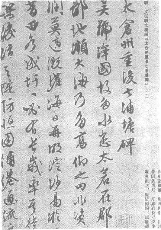 | 释义 | 文徵明行草书文稿册明。纸本。从23.8厘米,横14.4厘米。北京中国历史博物馆藏。文徵明(见《文徵明行草书西苑诗卷》条目)书。此册行草书文稿共三篇:一、《太仓州重浚七浦塘碑》,计六开,文末钤〈文徵明印〉白文一方印。二、《桑母王安人墓表》,计四开,文末钤〈文徵明印〉白文方印与〈衡山〉朱文一方印。三、《段子良墓志铭》,计四开半。合装成册页,每篇文稿前后均钤有项子京收藏印数方。册后有省甫、谢道承及陈坦题跋、观款三则。这三篇文稿是文徵明晚年作品,其上虽有圈改增删,但仍严整干净,从而可以窥见文氏文思敏捷、态度严谨的作风。书体圆熟流畅,奔放潇洒,是文徵明晚年行草书的重要作品。
