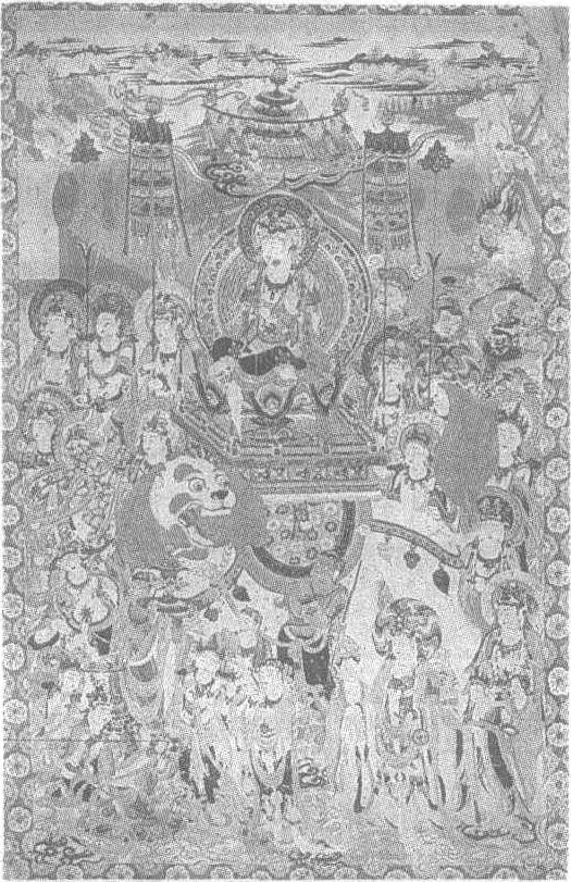 | 释义 | 文殊变图壁画中唐(吐蕃时代)。纵192厘米,横125厘米。甘肃省敦煌县莫高窟第159窟西壁龛北侧壁画。智慧之神文殊菩萨通常骑狮侍于释迦佛之左侧。图中的文殊菩萨头戴花冠,装扮十分华丽,坐在驮于狮背的高台上。狮子怒目、张口回首。一昆仑奴双手持缰,试图将它驯服。文殊前有跪捧花瓶、供器的供养菩萨,表情各异,有的矜持,有的专注,有的喜形于色。此外还有帝释、梵天、天龙八部等围绕。其中一组伎乐最为生动,为三人组成,演奏拍板、横笛和笙,有的眉飞色舞,有的陷于乐思之中。奏笙者脚趾的动作应和着音乐。图中人物表情恬美,线描技法娴熟,色彩柔和,颇具仙境之感。