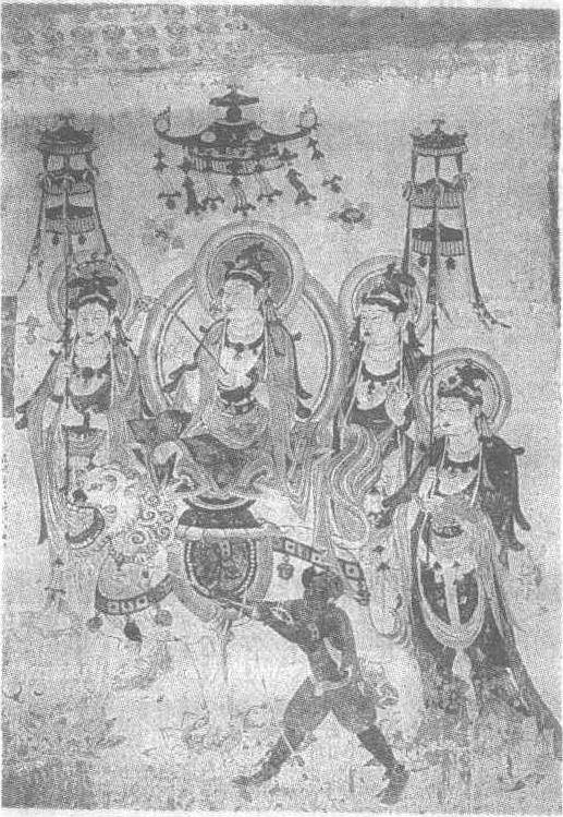 文殊变图壁画中唐(吐蕃时代)。纵245厘米,横195厘米。甘肃省安西县榆林窟第25窟西壁北侧壁画。文殊坐于狮背,相貌端庄沉稳,眷属持幢幡相随。华盖、幢幡皆随风飘动。文殊座下之狮昂首怒吼,脚踩莲花,似要向前奋进。身旁的昆仑奴双手拉缰绳,用尽全身之力阻止狮子的前进。昆仑奴黑肤红衣,身体健壮,与狮子形成相持局面,造型十分生动。此图线条洒脱,晕染富于层次,色彩柔和,是这个时期壁画的代表作。