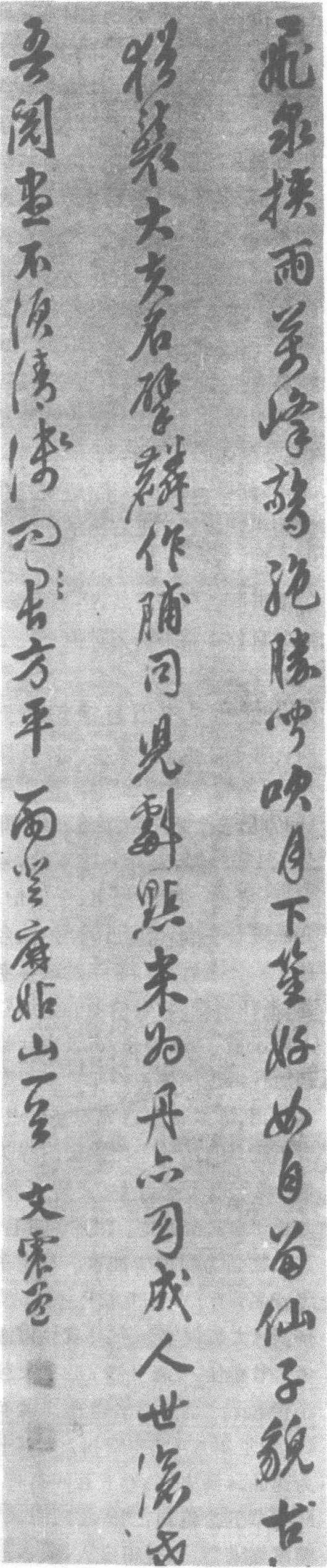 | 释义 | 文震孟行草书七言律诗轴明。绢本。纵197.7厘米,横42.4厘米。江苏省苏州博物馆藏。文震孟(见《文震孟行书七言诗扇面》条目)书。七言律诗:“飞泉挟雨万峰惊,绝胜闻吹月下笙。好女自留仙子貌,古松犹袭大夫名。擘麟作脯同儿剧,点米为丹亦幻成。人世沧桑吾阅尽,不须清浅问君(此字点去)方平。”款署:“雨登麻姑山一首,文震孟。”字体长短、大小、疏密、宽窄不齐,各具其态,笔法爽朗、稳健,起伏顿挫,不历不激,运笔用墨浓细相间,血脉相连,神采映发,堪称妙品。