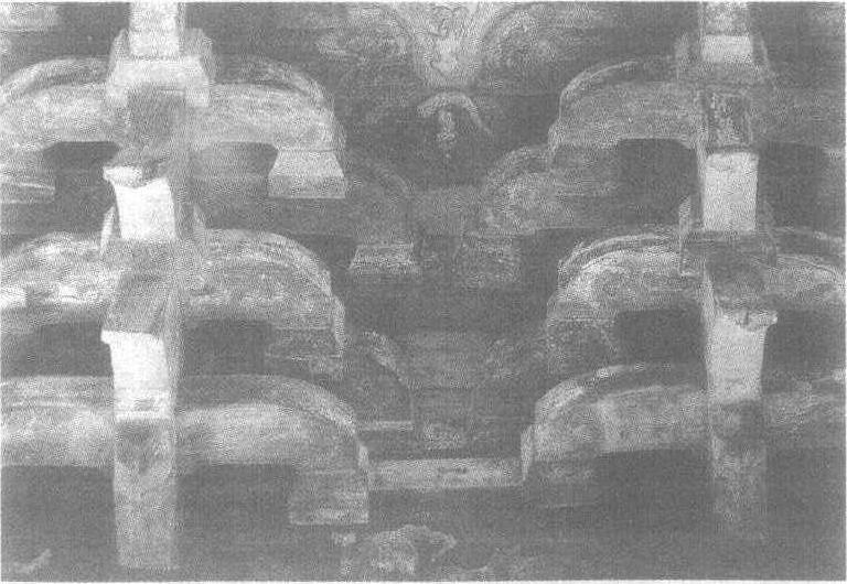 | 释义 | 034 斗拱中国传统木结构中的一种支承构件。处于柱顶、额坊与屋顶之间,主要由斗形木块(称斗)和弓形的横木(称拱)纵横交错层叠构成,逐层向外挑出,形成上大下小的托座。这种构件既支承荷载梁的作用,又兼有装饰作用,为中国传统建筑造型的主要特征之一。 155 斗拱见42034条。 斗拱中国古代木结构建筑独有的构件,放在木柱顶部和木梁上,用于层层出挑屋檐的木构件,又称铺作。由“斗”,即斗形木垫块和置于斗上的弓形短木“拱”做为基本构件层叠演变而成。斗拱的形象曾出现于西周至南北朝时期的明器、画像石及画像砖上,唐至元代,斗拱被用来承托在纵横井字梁的支点下,梁穿插在斗拱中,二者共同承重屋顶结构,这个时期的斗拱雄壮有力,使承托的屋顶出檐深远,形成唐风建筑的宏大风格,到明清时期,柱头开始使用大小额枋和随梁枋,建筑的梁不再穿插于斗拱中,而是压在斗拱最上 一跳,斗拱尺度变小,间距变密,柱间斗拱由宋代的一至二组增至六至八组,不再起维系构架整体性和出檐作用,成了在柱和屋顶构架间,主要起装饰作用的构件。