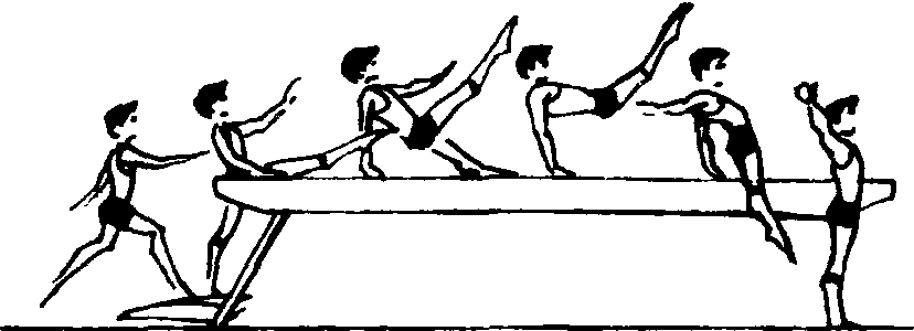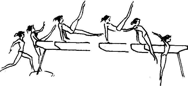 保护与帮助 保护者站在练习者马(箱)右(左)后侧位置,当练习者跳起后,一手握其上臂,一手托背部,助其推手越马(箱)。 教学重点 ❶在掌握单脚起跳、摆腿的基础上,练习完整动作。 ❷收腹、举腿、翻臀、直臂撑马(箱),切勿屈腿、跟上体。 |