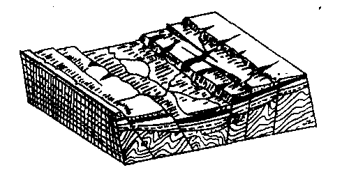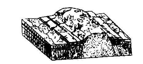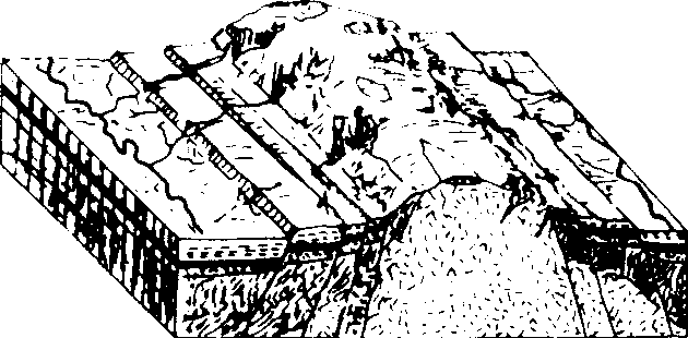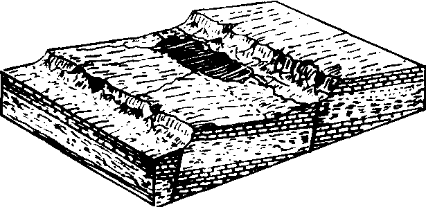 地 垒 断层岩层或岩体中的一个或一组破裂面或岩块间的一种不连续面。表现为沿破裂面两侧的岩层或岩体发生显著的位移或岩块在平行于不连续面的方向上发生相对位移。构成断层的破裂面称“断层面”。断层面与地面的交线称“断层线”。参见“断盘”。 断层岩层或岩体中的一个或数个断裂面,其两侧的岩层或岩体沿断裂面发生显著相对位移,而且在断面上遗留有位移时相互摩擦的痕迹,或在断面上下之间的裂隙中填充有因位移摩擦形成的角砾岩、糜棱岩或断层泥等。断层面有0°~90°不同的倾斜,除直立的90°以外,在倾斜断层面以上的岩层或岩体,称为上盘,断层面以下的称为下盘。根据断层上、下盘的相对位移,可以分为正断层、逆断层、平移断层3大类。 |