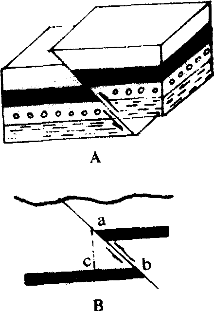 图7 逆断层 A. 上盘顺断层面倾向向上滑动; B. 逆断层剖面示意图