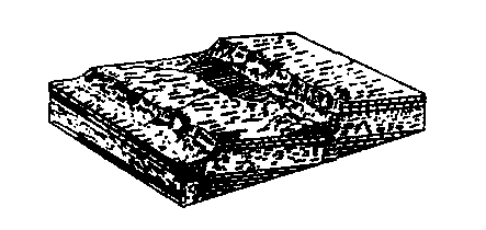 图6 地垒 ❷逆断层:指上盘相对上升,下盘相对下降的断层(图7)。逆断层是在压应力或水平挤压力作用下产生的。断层面倾角在45°以上的逆断层,叫冲断层。断层面倾角在45°以下的逆断层,称逆掩断层 (图8)。如果断层面倾角平缓,规模十分巨大,称推覆构造,或辗掩构造。如果冲断层平行重迭出现,称叠瓦式构造。较大规模的老岩层逆掩推覆在新岩层之上,若这些老岩层遭剥蚀而使下伏的新岩层露出一部分,叫构造窗(图9,W)。如果只残留一部分老岩层,周围出露都是新岩层,使老岩层以孤峰的形式坐落在新岩层之上称为飞来峰 (图9,N)。