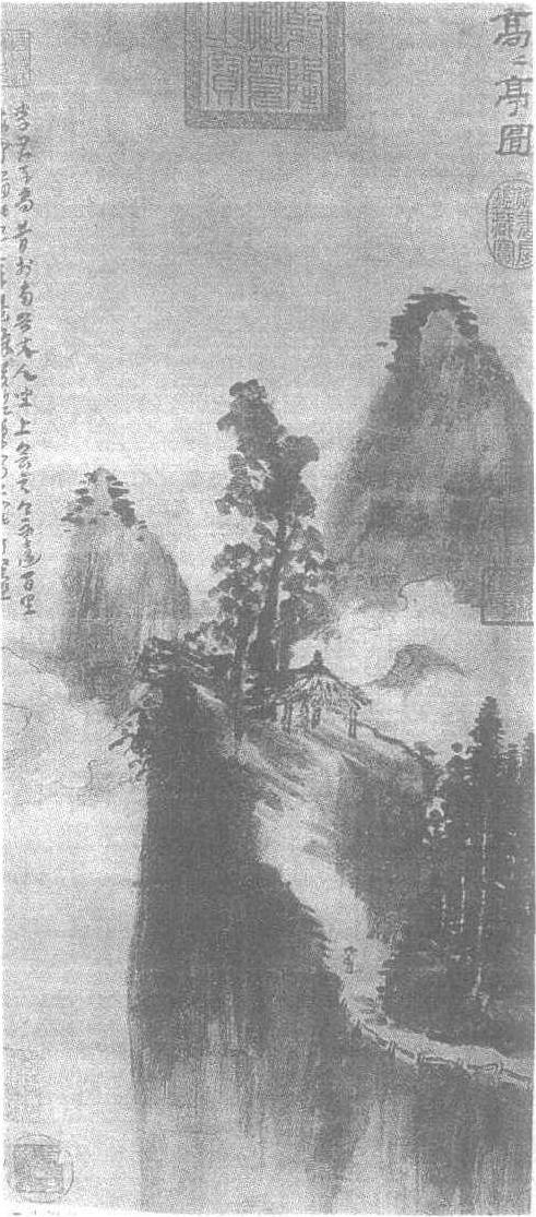 纸本,墨笔画。纵62.1厘米,横27.9厘米。现藏台北故宫博物院。画中峰直插云端。下有栈道直达山亭,山高入云而不见其脚,只画近中景,并略去开合,造成近在咫尺、迫在眉睫之感。整个作品笔墨如泼,气势酣畅,尽去古人成法规范,颇有信手涂抹,一气呵成的效果。画上自题: “醉后纵笔写之。”