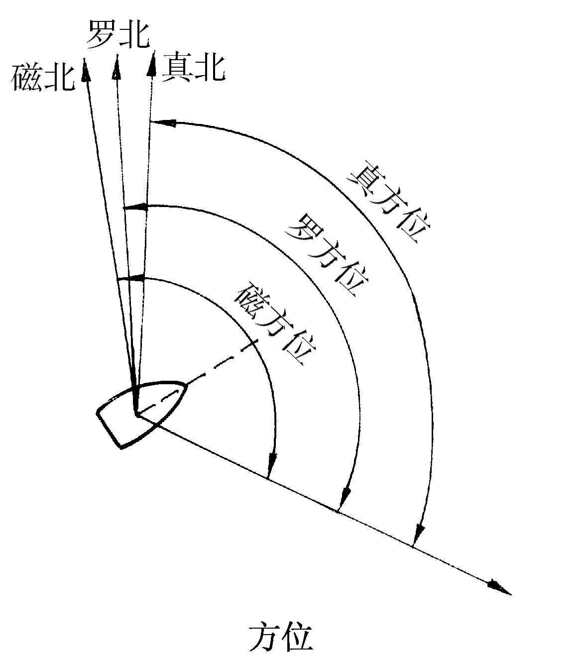 | 释义 | 方位bearing观测者子午线北向线顺时针方向与物标方位之间的夹角。地球表面上连接测者和与物标的大圆弧物标方位圈,方位圈平面与观测者水平面的交线称为物标方向线。方位可用圆周法和半圆法表示,圆周方位的计量范围为000°~360°,用三位数表示。以地理子午线北(真北)为基准度量的称为“真方位(TB:true bearing)”,以磁子午线北(磁北)为基准度量的称为“磁方位(MB:magnetic bearing)”,以罗经北为基准度量的称为“罗方位(CB:compass bearing)”。半圆周法是以测者的正北或正南为基准(0°),向东或向西度量到物标方位线,计量范围为0°~180°,并在度数后面表明起算点和度量方向,此法较多用于表示天体方位。