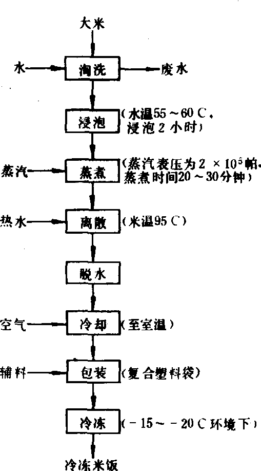 图1 生产罐装米饭的工艺流程 冷冻米饭 冷冻的熟米饭比用原料大米煮饭,节省时间、食用方便。生产冷冻米饭的加工工艺流程见图2。冷冻米饭也可与盆菜配合,加热后即可食用。这种米饭与新煮的米饭,在色泽、米粒的分离性、风味和组织等方面完全相同,在-20℃冷冻贮存1年,对品质无损害。
