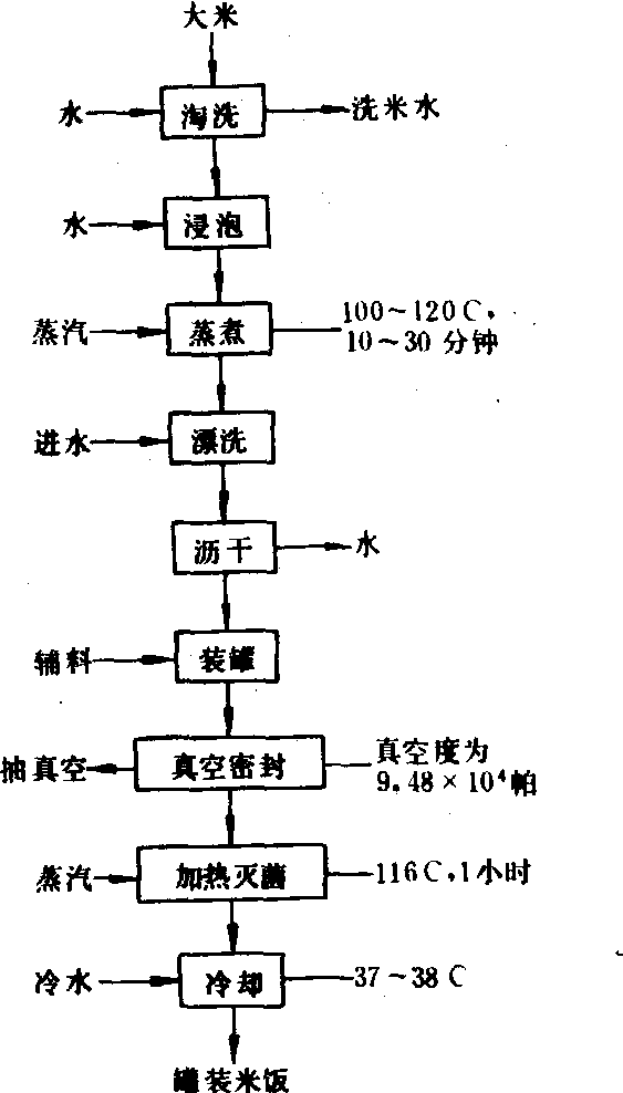 图2 生产冷冻米饭的工艺流程 速煮米饭 又称脱水米饭,将精大米用水淘洗后,放在高温高压的容器内蒸煮,使大米淀粉充分糊化,然后再进行快速干燥、冷却包装即成。食用时只要将速煮米饭用开水浸泡几分钟,即可食用。这种米饭是美国在第二次世界大战期间研制成功的,由于它含水分低、易于贮存、携带方便,主要供军用。日本也用它作军粮,战后已转为民用,成为学生午餐和旅游等的方便主食。根据采用不同的水分含量、预煮时间和温度、干燥条件及其他加工参数,能够生产各种类型的速煮米饭。现将几种制作工艺介绍如下:❶常压蒸煮法。这种加工工艺比较简单,基本上采用普通煮饭的方法。将淘洗过的大米浸泡到含30%水分,在常压下蒸煮30~50分钟,使米粒充分糊化,水分增加到60%~70%,经过冷水冲洗离散,在80~150℃下经28~60分钟,干燥到8%左右的水分,冷却到室温,再经筛选除去碎粒,最后进行成品小包装。这种速煮米饭的多孔性差,复水时间较长,一般用沸水浸泡需8~10分钟,用温水浸泡需40~50分钟才能复水成饭,但具有较好粘弹性和口味,能保持一定的新鲜度。 ❷预热处理加工法。将精白米先经50~150℃热空气沸腾状预热处理6~8分钟,使米粒部分失水,表面产生无数细密裂缝;然后在85~95℃的热水中浸泡,使米粒水分增加到30%以上;再经常压蒸煮60~70分钟,水分增加到60%~65%,在冷水中冷却、冲洗1~2分钟,使米粒分散,送到网带式干燥机上,用140℃高温空气干燥,使米粒的水分降到8%~10%;最后进行冷却、筛选和成品称重包装。由于米粒开始就采用高温快速干燥,使其表面水分蒸发速度,快于内部水分向外扩散速度,从而使米粒造成多孔性结构。采用这种工艺制作的速煮米饭,因米粒呈多孔性,复水性能好,食用时只要用热水浸泡3~5分钟即能成为米饭。缺点是复水后的米饭散渣性大,缺乏新鲜米饭的粘弹性,口味稍差,营养成分流失较大。 ❸高温膨化加工法。米粒在蒸煮前或干燥后,采用高温膨化。膨化温度为280~320℃,时间为12~15秒钟,使其内部结构疏松。无论采用先膨化,或是干燥后膨化,复水性能都较好,用沸水浸泡5~7分钟就能复水成饭,用冷水经20~30分钟也能复水成饭,具有新鲜米饭的口味。 ❹冷冻升华干燥法。将米粒经浸泡、蒸煮和离散后,采用冷冻升华干燥。这种速煮米饭多孔性好,复水性能也好,只需3~5分钟便能复水成饭,但生产成本较高。此外,速煮米饭也可采用油炸法制作,以蒸熟的米饭,放入油锅内煎炸、干燥,产品的孔隙度好,容易复水,但米饭含油量较高,而且容易氧化变质。为了防止油脂氧化,应采用氢化油或饱和度高的油如棕榈油煎炸。 |