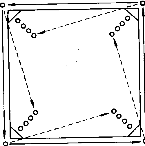 适用于3—6年级,可以提高学生传接球技术和快速奔跑能力。器材 足球2—4个。场地 在足球场上画两个边长为10米的正方形,在四个角上分别写上1、2、3、4号。游戏方法 将参加游戏的学生分成人数相等的甲乙两队。每队再平均分成四个组,分别站在1、2、3、4号角,1号角的第一名学生脚下停1球。教师发出口令后比赛开始,两队1号角的学生沿逆时针方向,迅速把球