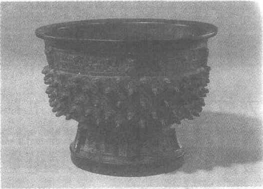 商。盛食器,礼器。高18.2厘米,口径24.7厘米。台北故宫博物院藏。圆形,平口,腹较深,高圈足。口沿下一周有三饕餮、三棱,间饰夔纹。腹饰斜方格雷纹,方格雷纹中有长乳钉纹。腹内有图形铭文一字。此器为商代后期的用器。