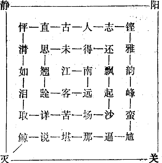 敦煌唐人佚诗残卷中的回文诗。作者佚名。存于S.5644卷,原题《方角书一首》。其排列方式是自中心向外呈正方形环绕,相连字间标以直线,从中心“江”字起,依线向外读,5字一句,到“关”字止,恰是一首五言律诗。原图如下: