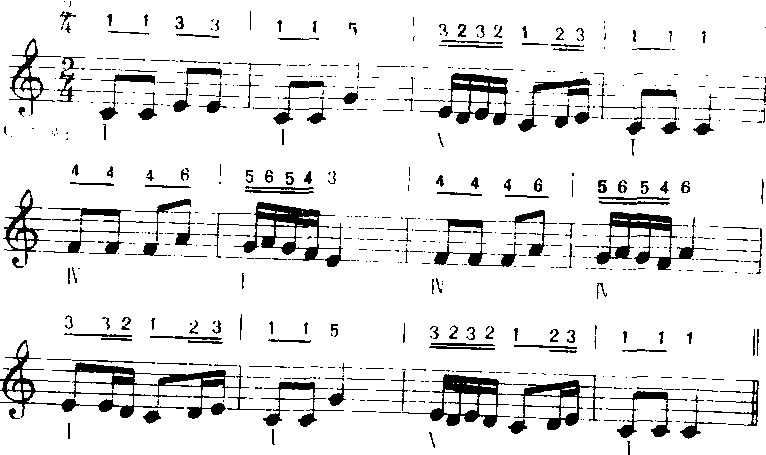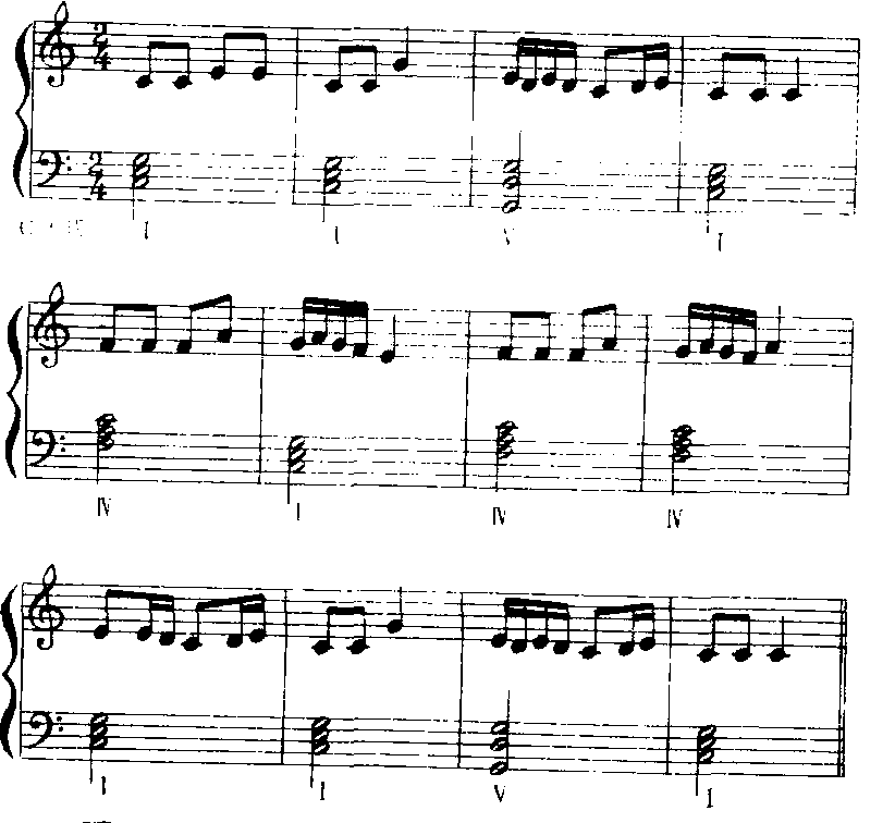 上例第8小节不能用V→Ⅳ。是反功能。只能用Ⅰ→Ⅳ的进行。 第11小节也可配Ⅴ,然后进入Ⅰ。 凡是有“+”的地方叫“和弦外音”(见以后讲)如果把和弦标记全部换成和弦写法,即可这样弹奏了: