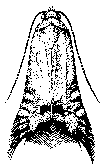 | 释义 | 旋纹潜叶蛾apple leaf-miner苹果沙果等果树潜叶的害虫。学名Leucoptera scitella Zel-ler。鳞翅目,潜蛾科。欧洲及中国西北、华北和东北有分布。为害苹果、沙果、海棠、梨、山楂等。成虫体长约2.3毫米,翅展约6毫米。全身银白色。头顶有竖起的毛丛。前翅端部金黄色,其前缘有数条黑色短斜纹。臀角有卵形黑斑,斑中央有银白色小点。卵近扁圆形,乳白有光泽。末龄幼虫体长约5毫米,扁平,污白色,后胸及腹部1、2节两侧,各有一管状突,上生一刚毛。蛹长椭圆形,长约4毫米,褐色。茧白色梭形(见图)。在河南、陕西、山东年生4代,河北、辽宁3代。以蛹在主干和主枝的粗皮缝隙茧内越冬。河南越冬代成虫于4月中旬至5月中旬发生,第一代6月中下旬,第二代7月中下旬,第三代8月中下旬,第四代9月中下旬。一般越冬代成虫发生期达一个月,其他各代发生期半月左右。河南4、5月份第一代卵、幼虫发育期间,气温变化较大,温度高的年份,当年发生5代者多达46%。反之,第一代发生期推迟,发生5代者仅占6.8%。多在上午羽化,成虫呈波浪式飞翔,在日光反射下出现银色闪光。夜间或天气不佳时,静止在叶背,枝干和树下。羽化当天成虫即交配、产卵。卵散产在叶背,每雌产卵50粒左右。幼虫孵化后即从卵壳底部潜入下表皮,呈螺旋形串食叶肉,在隧道内排粪。虫斑直径10毫米左右,末龄幼虫脱出叶片吐丝下垂,在叶片背面结茧化蛹。越冬代在枝、干等处结茧。一般前期发生轻,后期严重。叶片上虫斑逐代累积,严重时秋季叶片焦枯早落,对果树生长影响很大。幼虫和蛹常被白跗姬小蜂寄生,条件适宜时,秋季寄生率可达80%以上。但在使用广谱性杀虫剂过多时,常导致猖獗发生。防治措施是,秋季越冬代幼虫结茧前,枝干束草环诱集;休眠期刮、刷粗皮缝隙越冬茧,连同草环装入细纱笼内保存,待翌年越冬蛹内的寄生蜂羽化后再行处理。小幼虫为害期可喷洒杀螟硫磷,甲基对硫磷,敌敌畏,乐果等农药。落花后及秋季控制使用广谱性杀虫剂,保护寄生蜂,可减轻潜叶蛾的发生。