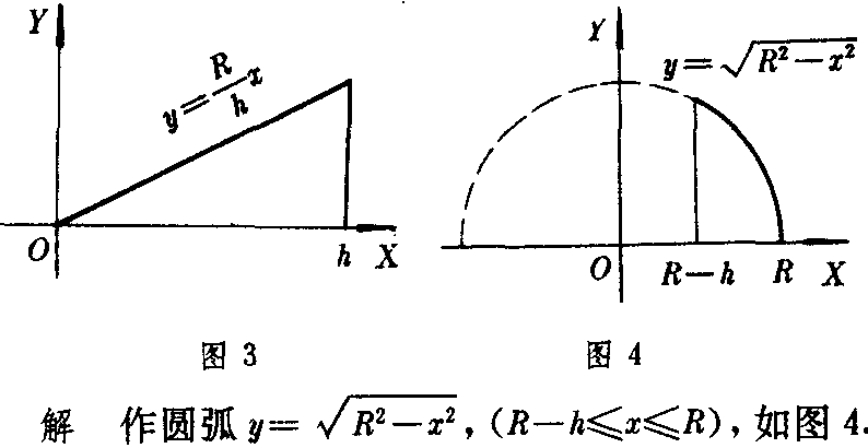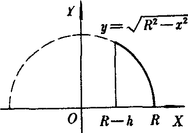 图4 解 作圆弧 (R-h≤x≤R),如图4.该圆弧与直线X=R-h及X轴围成的平面图形绕X轴旋转一周产生的旋转体就是已知的球缺. 由旋转体体积公式,它的体积