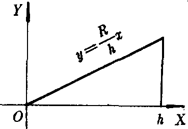图2 利用旋转体体积公式容易推出圆柱、圆锥、圆台、球缺的体积公式. 例1 求高为h,底面圆半径为R的圆锥的体积V. 解 作线段y=R/h x,(0≤z≤h),如图3.该线段与直线x=h及X轴围成的平面图形绕X轴旋转一周产生的旋转体就是已知的圆锥.由旋转体体积公式,有