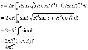 例 求半径为R的球的面积。 解 半径为R的球的面积S等于半圆x= Rcost,y=Rsint (θ≤t≤n)绕X轴旋转所成旋转体的侧面积。于是,根据旋转体侧面积公式,有