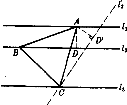 分析 如图,设△ABC是所求作的等边三角形.作AD⊥l2于D.把△ABD绕点A旋转60°,则点B落在C点上,AD旋转到AD′的位置,l2旋转到l2′的位置.由于点B在l2上,点C在l3上,点B旋转后又与点C重合.所以点C应是l2′和l3′的交点.这样便可得到作图的方法. 作法 ❶在l1上任取一点A,作AD⊥l2于D; ❷以AD为一边作∠DAD′=60°,且使AD′=AD; ❸过D′作l2′⊥AD′交l3于C点; ❹连结AC; ❺作AB,使∠BAC=60°,交l2于B; ❻连结BC.则△ABC就是所求的等边三角形. 证明 因为∠DAD′=∠BAC=60°,所以∠D′AC=∠DAB.又AD′=AD,∠AD′C=∠ADB=90°,所以△AD′C≌△ADB,因此AC=AB.于是∠ABC=∠ACB,又因为∠ABC+∠ACB=180°-∠BAC=120°.所以∠ABC=∠ACB=60°.因此△ABC为等边三角形. 讨论 在这个问题中,假如每一相异的位置都作为一解,那么应有无数解.但是这个问题一般都认为是活位作图,所以只讨论形状大小,因此只有一解. |