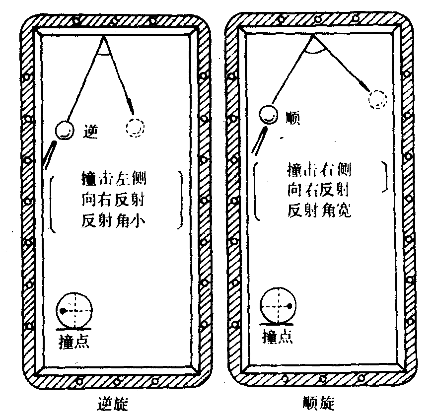 | 释义 | 旋转球杆法台球击球的一种方法。是用撞点为左侧或右侧的杆法击球,若撞击本球的右侧,则在向右旋的同时还向前行进,若撞击本球的左侧,则在向左旋的同时还向前行进,打旋转球的意图是使球产生侧旋力,也称侧旋球。侧旋球有顺旋和逆旋之分,使本球向右分离并反射,是撞击本球的右侧造成的顺旋。使本球向左分离并反射,是撞击本球的左侧造成的逆旋。(图2—3—41)采用顺旋或逆旋杆法,碰岸后会出现侧旋的变化。顺旋碰岸后,球的反射角会增大,逆旋碰岸后,球的反射角会缩小。