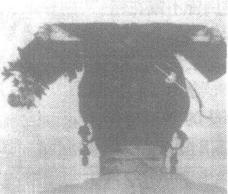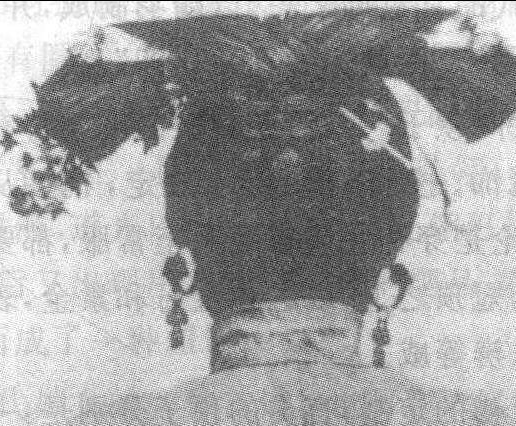 | 释义 | 旗髻清代满族妇女所戴的假髻。在道光以前,满族妇女梳髻,一般多在髻中插上一个筐架,俗谓 “架子头”。得硕亭《草珠一串》诗:“头名架子太荒唐,脑后双垂一尺长。”诗下自注:“近时妇女以双架插发际,挽发如双角形,曰‘架子头’。”从形象资料上看,这个时期的旗髻,尚未脱离真髻的范畴,体积也不大。咸丰以后,髻式逐渐增高,“双角”也不断扩大,进而发展成一种高如牌楼式的固定饰物,上面不用头发,纯粹以绸缎为之,戴时只要套在头上即可,俗谓“两把头”或称“大拉翘”。