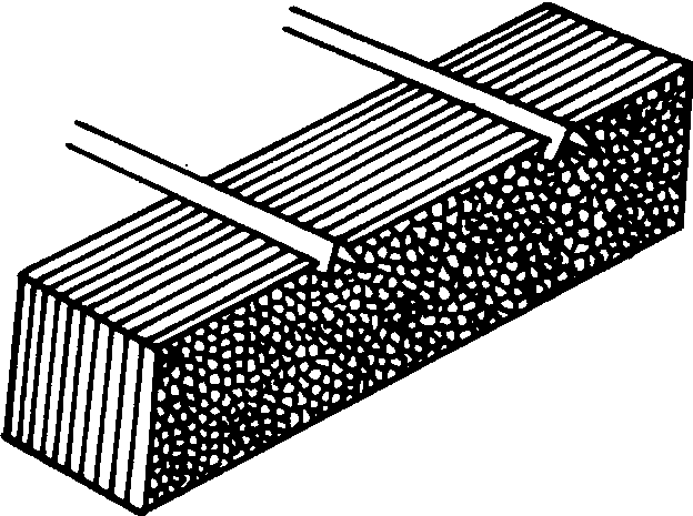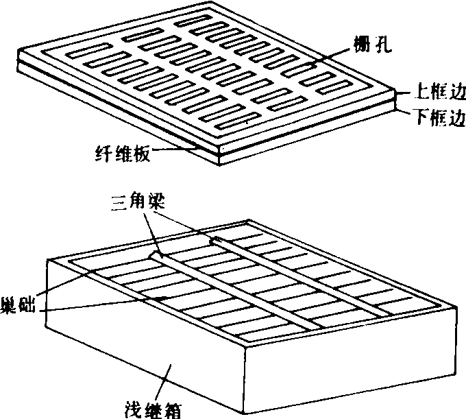 图1 栅板(上)和无巢框继箱(下)每块栅板有孔缝3列10行,每个继箱有9片巢础(可按继箱长宽而定) 铝三角梁 梁长464毫米(按继箱宽度而定),梁的两边各宽15毫米。每个继箱用两根铝三角梁支撑巢础(巢脾),防止栅板被蜜脾重量压弯。铝质梁有足够的强度,易于熔去粘在梁上的蜡,便于清洗,而且可插入巢础内。 巢础 每个继箱用9片巢础。巢础上部边缘以铝三角梁穿插固定(图2);随即将巢础均匀疏开,放入继箱内,各片巢础悬挂在三角梁上。 蜂蜜的采收加工 一个主要流蜜期结束或三个继箱装满蜂蜜时,在巢箱和继箱间加一脱蜂板(在一块副盖的四角各镶一个两孔脱蜂器)脱蜂。在24小时内可将继箱内的蜜蜂脱除,余下的少量蜜蜂很容易被吹去;把继箱的栅板取下,在粉碎机上将蜜脾震落入机;粉碎后的蜜蜡混合液经导管泵入离心分离机(脱脂器),以每分钟1000转的转速将蜜和蜡分离开。蜂蜜经过过滤,泵入贮藏罐。蜂蜡上浮,流入另一容器。一台分离机可供几个蜂场使用。