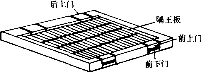 图2 用铝三角梁安装巢础将三角梁的两侧边插入一叠巢础上部边缘内再将巢础均匀分开 蜂群的季节管理 为了饲养强群,控制自然分蜂和使蜂群安全越冬,每年更新蜂王,采用12框改良达旦式大容积蜂箱、箱底隔王板和双王群饲养技术。箱底隔王板边框前后端的上下,各设有由门闩板控制的出入口(图3)。其他规格与一般平面隔王板相同。