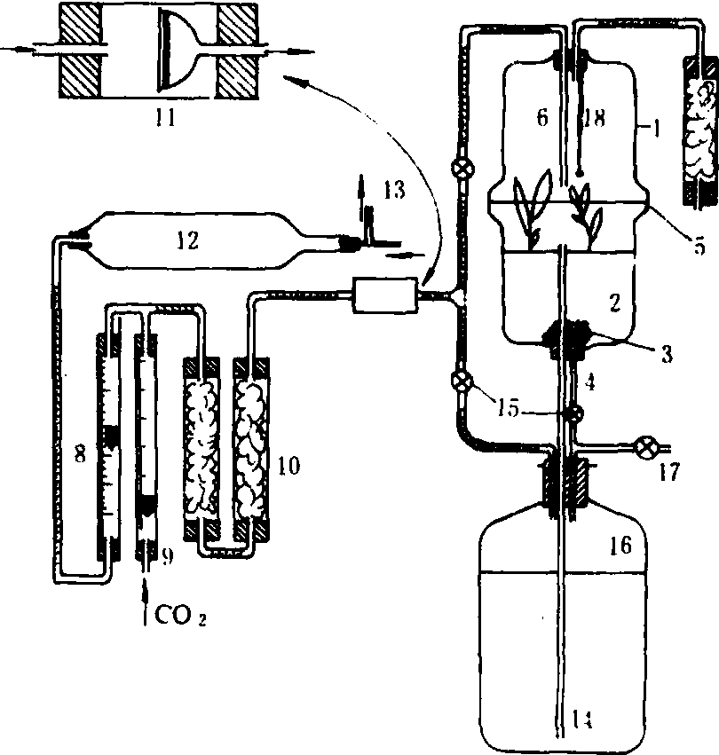 | 释义 | 无菌培养试验sterile culture experiment在无微生物活动条件下保持所研究成分不变的关于植物营养原理的试验。氨基酸形态的含氮化合物或有机磷化合物能否被根系直接吸收,必须在无菌条件下试验。可分为整株无菌培养和局部无菌培养。无菌培养技术要求严格。试验需在无菌室中进行,应杜绝每个环节发生微生物沾染的可能性。先要进行种子灭菌,通过用1%溴水、12%双氧水、0.25%~1%二氯化汞溶液处理种子。所用的容器、盆钵、导管、砂、营养液等材料都需经高压灭菌,并在试验过程中要严格检验无菌条件。但所研究的有机营养物质不应采用高压灭菌以免发生变化,应采用近代膜技术过滤以保持无菌条件。整株无菌培养装置如图1所示。局部无菌培养主要是根部处理在无菌环境中。图2为种苗及根系生长装置的放大详图。各种气体及灌溉都经过严密过滤,以保持无菌条件。