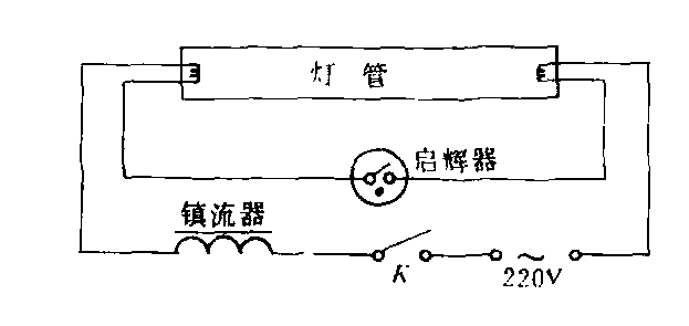| 释义 | 日光灯riguangdeng照明用的荧光灯。属于低压汞灯。见“气体放电灯”。 日光灯Riguangdeng一种利用气体放电发光原理制成的电光源。照明用的荧光灯即俗称为日光灯,是由灯管和附件镇流器、起辉器组成。其灯管内壁涂有荧光物质属于低压汞气放电灯。灯管内抽真空后充入少量惰性气体并注入微量液态水银。日光灯电路图如图所示。接通电源,日光灯开始启动,启辉器、镇流器共同激起的高电压,使灯管内的惰性气体电离而引起弧光放电,同时管内温度升高,使液态汞汽化游离,与惰性气体分子发生猛烈碰撞而放电。汞蒸汽放电时,辐射出大量紫外线,紫外线激发灯管内壁的荧光粉,发出可见光。发光的颜色与所用荧光粉的成分有关,照明用日光灯管内涂卤磷酸钙即发白色光。日光灯电路中镇流器的主要作用是,在启动时产生瞬时高电压使日光灯点燃,点燃后限制通过灯管电流,使灯管上的工作电压和通过灯管的电流为额定值。日光灯具有发光效率高、使用寿命长、光线柔和等优点,广泛用于室内照明。