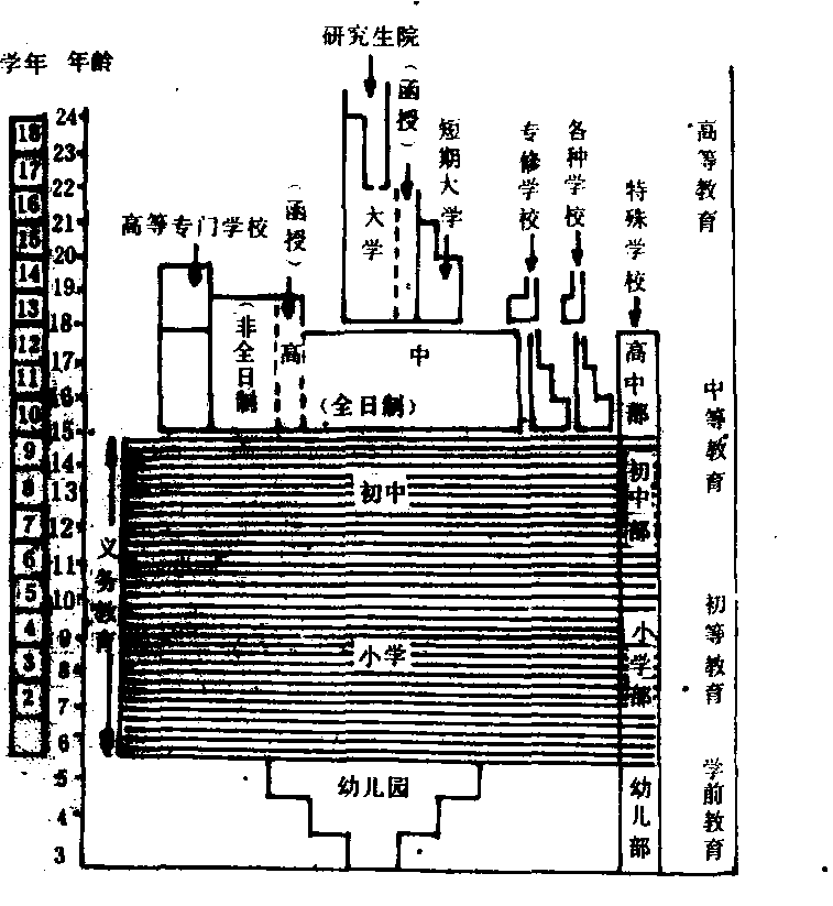 | 释义 | 日本学制Riben xuezhi日本的各级各类学校系统。日本政府1872年颁布的《学制》为现代学制的确立奠定了基础,以后又经过多次调整和第二次世界大战后的全面教育改革,形成了日本现行的学制。日本现行的学制为“6·3·3·4”式的单轨学制,即小学6年,初中3年,高中3年,大学4年。其中从小学到初中的九年为义务教育,另外还有1—3年的学前教育,2—5年的研究生教育。特殊教育在盲人学校、聋人学校或养护学校(即对弱智者和病残者实施教育的学校)以及中小学的特殊班级中进行,也是教育体系的一部分。为使高中教育和高等教育多样化、灵活化,日本还建立了定时制和函授制的高中、专修学校、“各种学校”、短期大学和高等专门学校等。其中定时制和函授制高中招收初中程度的在职青年,学制4年或4年以上;专修学校分3种,一种相当于高中程度,一种相当于短期大学的程度,还有一种开设普通课程,招收对象不限;“各种学校”是《学校教育法》所规定的“正规学校”以外的教育机关,它是实行类似学校教育的各种职业教育的学校总称,学制1—3年;短期大学招收高中毕业生,学制2年;高等专门学校招收初中毕业生,学制5年,前3年相当于高中教育,后2年属于高等教育。各类学校均分为国立、公立和私立3类,均实行男女合校的原则。