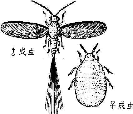| 释义 | 日本松干蚧matsumura pine scaleMatsucoccusmatsumurae Kuwana,又称松干蚧、松干介壳虫。同翅目,珠蚧科。分布于日本、韩国、朝鲜;中国主要为害区在辽东地区和山东省,现已蔓延到江苏和浙江两省。是森林害虫主要检疫对象之一。雄成虫体长1.3~1.5 mm,黑褐色;复眼大而突出;胸部膨大,后胸背面的刚毛分列成左右二群;前翅发达,有羽状纹;腹末有长蜡丝10余根。雌成虫体长2.5~3.3 mm,橙褐色,腹部有多数背疤。1龄寄生若虫梨形,体侧有白色蜡条。2龄无肢若虫扁圆形,体周围有蜡丝。年生2代。以1龄寄生若虫在皮缝内越冬。主要为害油松、赤松和马尾松枝干。被害枝干由于皮层组织被破坏,树势衰弱,生长不良,树皮卷曲翘裂,针叶枯黄;且常引起下期病虫害的发生。宜加强植物检疫。以用内吸杀虫剂涂干或打孔注药,毒杀寄生若虫;保护天敌瓢虫为主要防治措施。