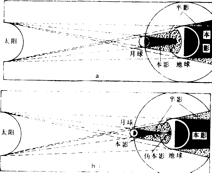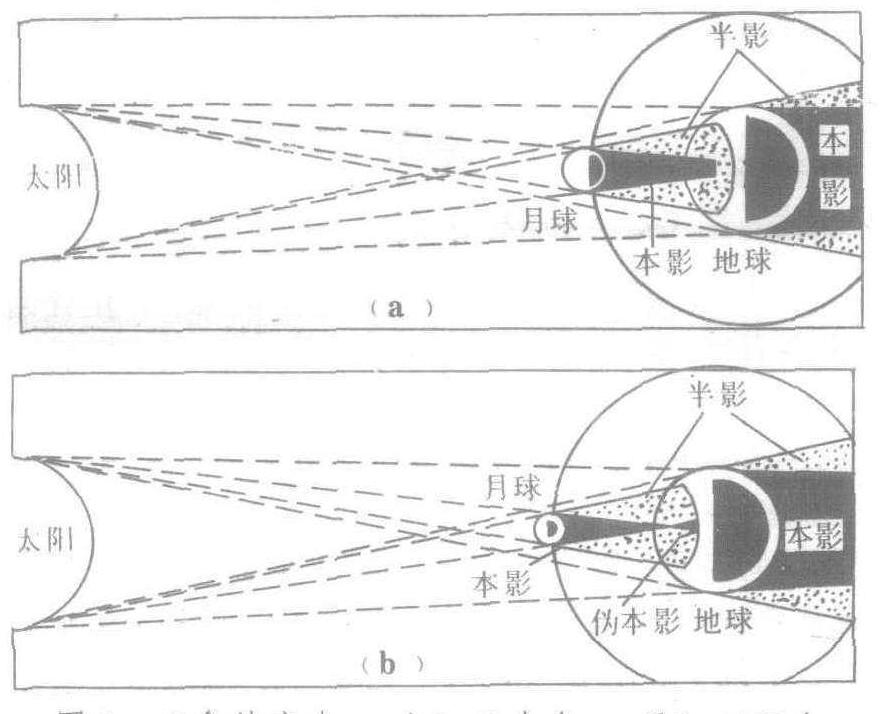 图1 日食的产生 (a) 日全食 (b) 日环食