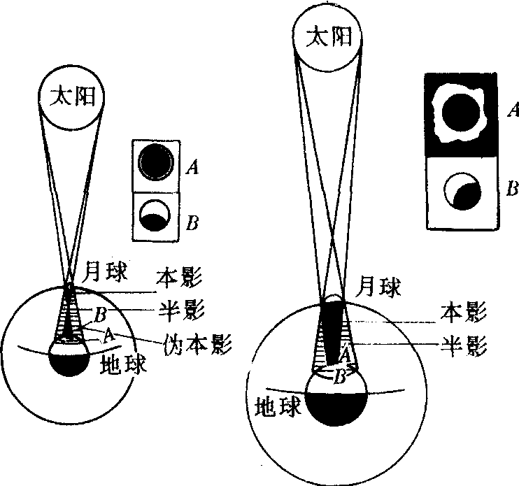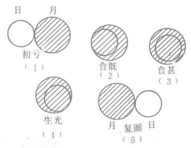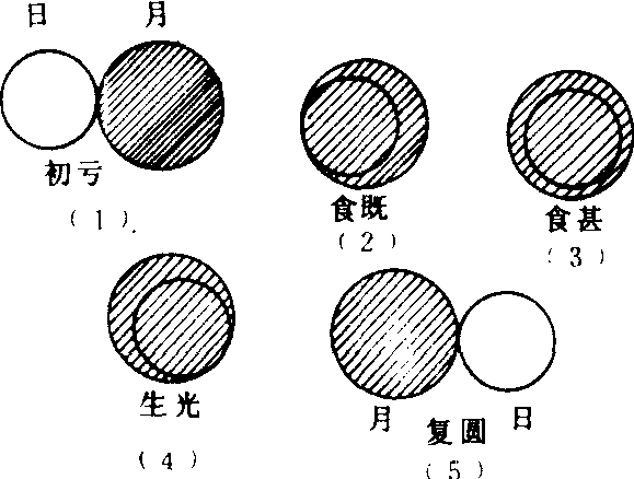 图2 每当朔日(农历初一)月球就会走到太阳和地球中间,但由于月球与太阳运行的轨道不在同一个平面上,两个轨道平面有约5°9’的夹角,因此在一般的朔日,太阳、月球和地球并不正好处于一条直线附近,而不能发生日食。只有当朔日,月球和太阳都运行到两个轨道交点附近时,才能发生日食。由于月球,太阳都是有视面的天体,只要日月视面相切就意味着可能有日食发生。实际上在朔日,太阳只要在两个轨道交点15°4’以内就一定能发生日食,在交点18°5’以内就可能发生日食。因为地球绕太阳和月球绕地球的运动都是有规律的,因而日食的发生也有规律性。月球绕地球的朔望周期平均为29.53天,而太阳连续两次过两轨道的同一交点的时间间隔平均为346.62天。因此,日食重现的周期应为它俩的最小公倍数,古代巴比伦人很早就发现了日食具有223个朔望月的周期,即19个交点年为6585.78天,223个朔望月为6585.32天,二者相差不多。此周期为回归年的18年11.3天或10.3天,称沙罗周期(沙罗即重复的意思)。但因沙罗周期有一个0.3天的尾数差,因此下次日食来临时,地球在0.3天里又多转了100多度,因此日食发生的地点、时刻、食分就与上次大不相同。我国古代也曾提出过好几种类似的日食规律,如汉代《太初历》就记载了日食具有135个朔望月的周期。近代,美国天文学家纽康从天体力学理论出发,总结出了著名的358个朔望月,即10571.95日的“纽康周期”。 日食Rishi太阳被月球遮掩的一种自然现象。月球在绕地球运行过程中,走到日地之间,月球的影子落到地球表面上,这时,位于影子内的观测者可能短时看不到太阳或只能看到太阳的一部分,这就是日食(见图)。由于地球轨道和月球轨道间存在5°09′的夹角,因而不可能月球每绕地球一周,就发生一次日食。日食的产生有两个必要条件:一是必须在朔日;二是太阳——月球——地球要靠近同一直线,即同时经过黄白交点附近。日食分为三种:即日全食、日环食和日偏食。月球比太阳和地球小,其影子分为本影、伪本影和半影三部分。日、地、月三者的相对位置及它们间距离的变化,决定本影、伪本影和半影所扫过地区的位置,从而决定着日食的种类。日食时,地球上处于本影范围内的观测者,会看到太阳被月球全部遮住的现象,即日全食;处于伪影内的观测者,会看到月球只遮住太阳的中央部分,周围仍有一个光亮的圆环,即日环食;处于半影范围内的观测者,可看到一部分太阳被月球遮挡的现象,即日偏食。而处于本影和伪影交界区的观测者,则可在日食发生的开端和最后阶段看到日环食,中间阶段看到日全食。(见图1)。日食过程可分为五个阶段:(1)初亏此时月球圆面东缘刚与太阳圆面西缘相外切,日偏食开始。(2)食既这时月球和太阳两圆面的东缘相内切,日食开始。(3)食甚这时月球圆面中心和太阳圆面中心最近。(4)生光此刻月球和太阳两圆面的西缘相内切,日全食结束。(5)复圆这时月球圆面西缘与太阳圆面东缘相外切,日偏食结束(见图2)。只有日全食才具备以上五个阶段;日偏食只有初亏、食甚和复圆三个阶段;环食没有食既和生光,而有环食始和环食终。日食之时,是人们研究太阳的好时机。观测日食,可以用肉眼看到“日饵,”即太阳的热的氢气层的运动,还可看到“日冕”即太阳最外层的大气。全世界每年最多可发生5次日食,最少2次日食。由于投到地球上的月球影子只能遮掩地表局部地区,一次日食中只有昼半球的小部分地区可观测到。因而,就地球上某一点而言,偏食平均每三年可看到一次,而全食则平均需三百多年才能见一次,日全食是很罕见的。