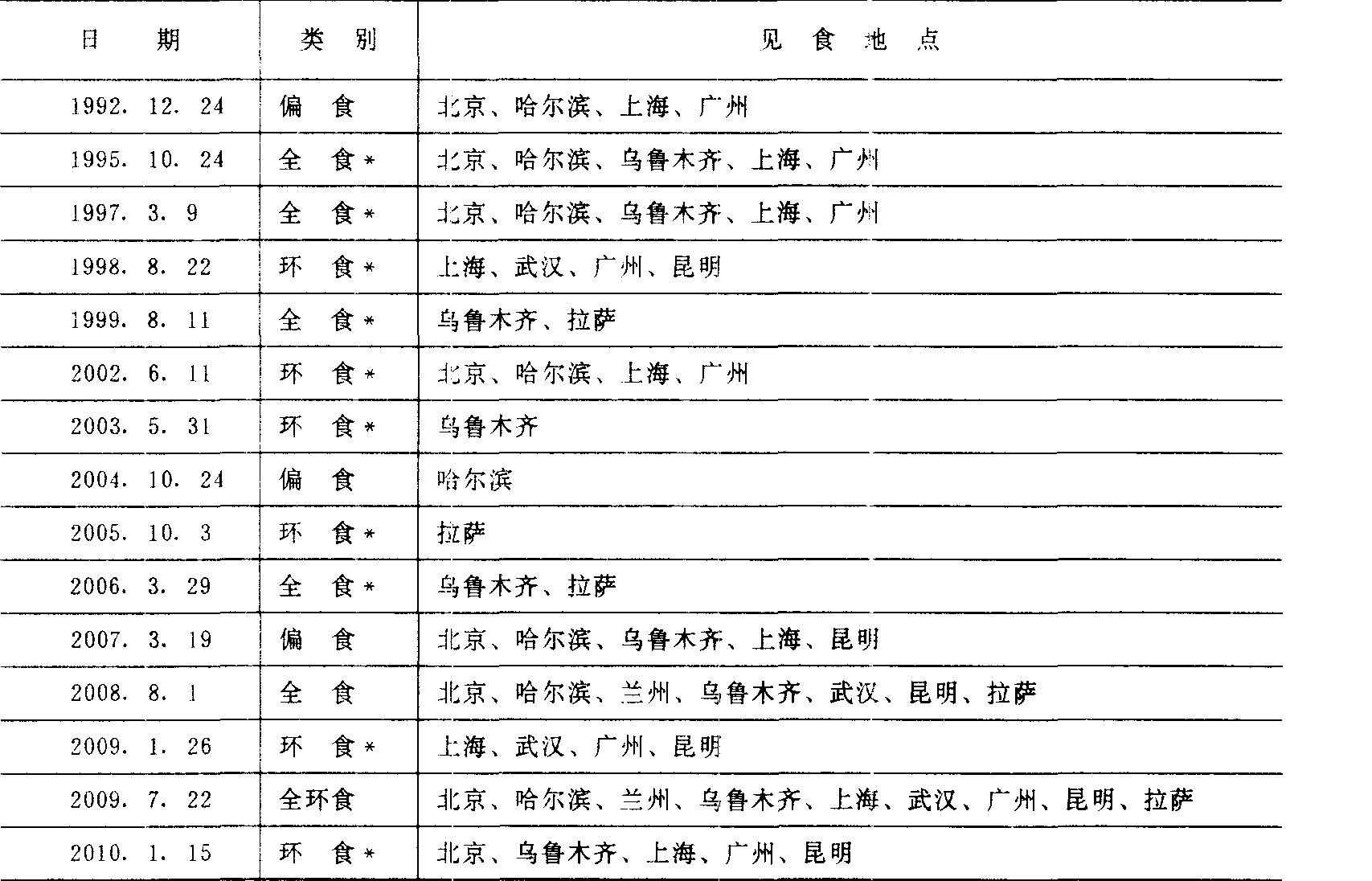 图2 日全食的五个阶段 月球不大而离地球距离有远近变化,所以月球本影扫到地球上只有200公里左右宽,有时才几十公里宽,能看到日全食的地区面积很小,即便看到也只有20秒~7分钟的时间。而通过观察日全食可以得到日冕等太阳高空大气的情况和其他平时难以得到的宝贵资料。特别对于业余爱好者,这种观测时机是不可多得的。根据计算,一年最少发生2次日食,最多发生7次日食和月食。但对某一地区来说,发生日食,特别是日全食就很罕见了,类似的交食要经过约18年零几天即6585.32日才重复一次,这个周期叫沙罗周期。下表列出1992年至2010年我国能见到的日食: 我国能见到的日食表(1992—2010)