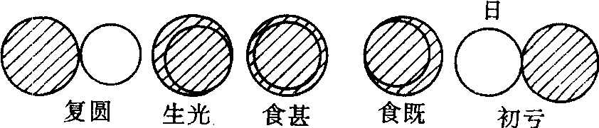 图1 由于月球每日向东移动速度大于太阳每日向东移动的速度,因此,日食时是月球追上太阳,月球的东边缘最先接触太阳的西边缘,所以日食总是从日面的西边缘开始。一次完整的日食过程可分为初亏、食既、食甚、生光、复圆五个阶段。如图2。日环食没有食既和生光,而有环食始和环食终。日偏食只有初亏、食甚和复圆。日食的程度常以食分表示,日全食的食分定义为,月球视直径与太阳视直径的比。因此,日全食的食分大于1或等于1,日偏食和日环食的食分小于1。一般讲食分越大交食的时间越长,对于同一次日食,不同地区所见食分不同。