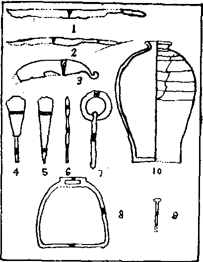 | 释义 | 旧站墓群属金代墓葬。位于吉林省永吉县乌拉街乡旧站一条漫岗上。东距汪屯金代遗址约2公里,东南距后岗子金代遗址3公里,东北距三家子金代“三家里”城址约4公里,北面濒临松花江。自1985年以来,当地农民在搞农田基本建设时,相继发现近30座古墓,均有木棺痕迹,且经火烧,出土随葬品上百件,即有铁刀、铁矛、铁镞、铁甲片以及缸坛等。1987年10月当地村民在此地发现同类墓葬1座,经县文物管所派人调查征集、获得随葬品12件,即:铁刀3件、铁镞4件、铁马镫2件、马衔1件、铁钉1件、缸坛1件(见图)根据墓葬的特点、出土随葬品的种类和形制,结合附近的金代遗址和城址,可以判断这群墓葬概属金代遗存。