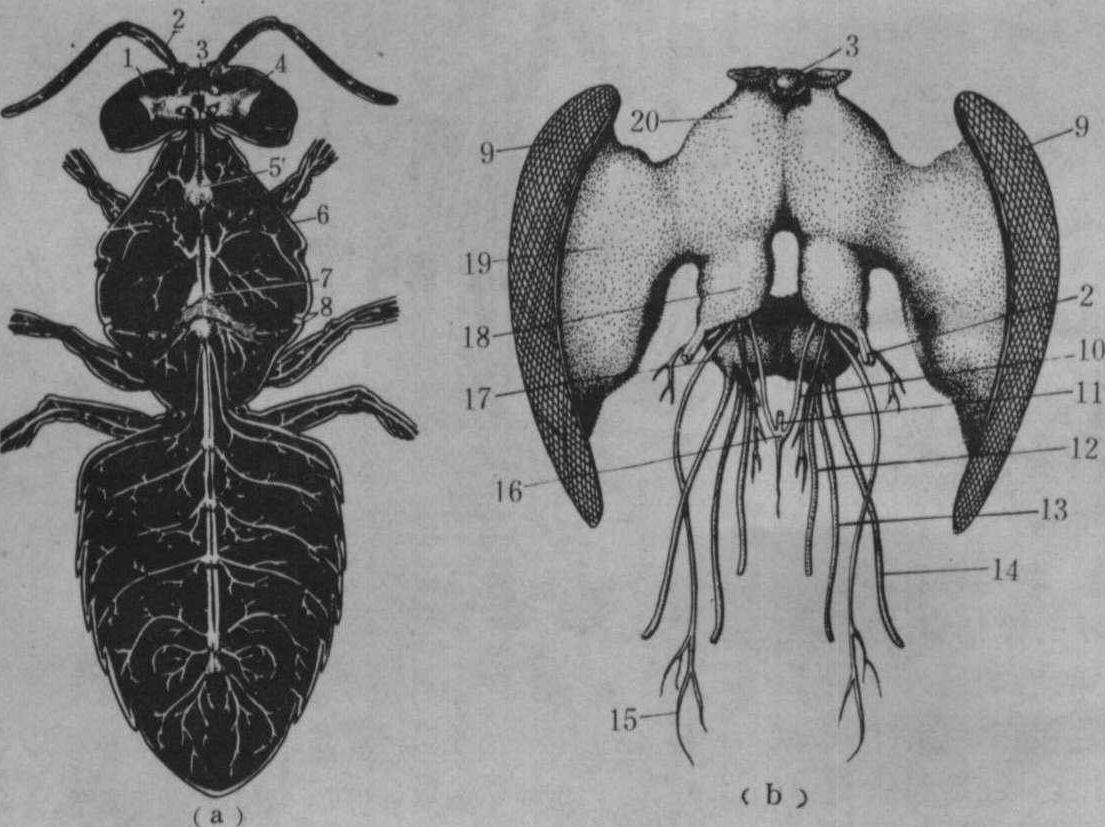 工蜂神经系统 (a)工蜂神经系统背面观; (b)工蜂的脑食管下神经节及头部主要神经前面观 |
