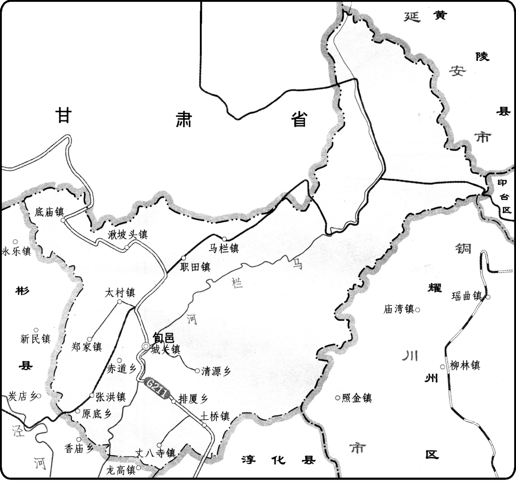 旬邑县政区图 旬邑县咸阳市辖县。位于咸阳市区北部150公里处,北与甘肃省正宁县接壤,东和黄陵县、耀县、铜川市为邻,西与彬县相望,南和淳化县相连。长69公里,宽25公里。面积1811平方公里,其中耕地51.88万亩。地处黄土高原南部,地势由东北向西南倾斜,并分为两个地貌单元。东部是子午岭土石山的延伸部分,峰峦重叠,海拔一般为1400~1600米,石门山是全县最高峰,海拔1855米。西部沟壑纵横,原面破碎,由4大沟分割成5条原,形若手掌伸出的5指。原面支毛沟密布,1公里以上的沟就有287条,海拔900~1400米之间,县城海拔960米。属暖温带大陆性季风气候,年平均气温9℃,积温4308.2℃。1月均温—4.6℃,7月均温20.2℃。年日照2407小时。年降水量577.8毫米。无霜期181天,雨热同季。山区平均气温7℃,是陕西省“冷区”之一。主要灾害是霜冻和冰雹。农作物资源有12类135个品种。野生植物以药材为主,有120余种,其中柴胡、黄芪、秦艽、苍术较多,尤以黄芪、党参、猪苓为贵。山区天然乔木96.7万亩,有阔叶、针叶两类47个品种,林木总积蓄量257.5万立方米;灌木有沙棘等23个品种;植被覆盖率在90%以上。高原区主要是人工林,有13.6万亩。草地面积46.4万亩,已查清的牧草有41科108种。动物资源有牛等家养畜禽12种,野生动物30多种,其中野猪、黄羊、野兔、山鸡较多,水獭、豹、画眉、杜鹃较为珍贵。矿藏以煤为主,初步探明储量12亿吨,埋深50~190米,煤层厚1~15米。此外,还有石油、石灰石、陶土等。河流主要有三水、姜家、支党三条,均系泾河左岸一级支流。三水河自东而西,境内流程122公里,平均流量2.91立方米/秒,流域面积1280平方公里,占全县总面积的75.4%。另外两条小河,分别在县城南部和北部自东向西流过。地表水年径总流量1.25亿立方米。全县常住人口23.68万,其中农业人口22.5万。境内居民以汉族为主,占总人口的99.9%以上。辖城关、土桥、职田、太村、张洪5个镇和马栏、后掌、湫坡头、底庙、郑家、赤道、原底、排厦、丈八寺、石门、清原、第界12个乡,279个村。县政府驻城关镇。该县古属豳地,周文王将其第17子姬荀封于此地为郇(郇、荀同音)侯,秦襄公时承郇侯的封地置邑,名郇邑,西汉置栒邑县(1964年国务院公布将栒邑改为旬邑),一直沿用至今。旬邑西周时属王畿。秦时属内史。西汉时属右扶风。三国时属雍州北地郡。晋时属雍州新平郡。隋时属北地郡。唐、宋、金、元、明时均属邠州。清时属直隶州。1935年冬,该县东部地区解放,在今底庙乡郭村设永红县,后掌乡杨坡头村设新正县,属关中特区领导,特区机关驻职田镇马家堡。1937年撤销永红县,划归新正县。1948年4月全县解放,撤销新正县,旬邑县归关中分区管辖。1949年改属邠县分区。1950年5月归属咸阳专员公署。1953年改属宝鸡专区。1956年改由省直辖。1958年并入彬县。1961年恢复原县建制,属咸阳地区行政专员公署。1983年咸阳地区改为咸阳市,遂为市辖。该县名胜古迹主要有距今1200万年的上新世时代的西原古象化石,始建于北宋嘉祐四年(1059)的七层八角楼阁式泰塔,清嘉庆年间百万富翁唐景忠后裔留下来的唐家地主庄院,还有为纪念1928年在中国共产党领导下农民武装暴动而修建的 “旬邑革命暴动烈士纪念碑”和中央陕甘宁边区关中地委旧址。主要历史人物有明礼部主事文在中,唐兵部尚书侯君集,北宋理财家范祥,以及曾任陕甘宁边区政府委员的肖之荷,旬邑革命暴动的组织领导者许才升,曾任中共陕西临时省委秘书长等职、后被敌人活埋的烈士崔廷儒。旬邑是古老的农业区,有“天府”、“海陆”之称。1949年以后,特别是改革开放以来,农业生产力有了较大发展,农村产业结构调整取得了较大成就。到1990年末,修造水平埝地、梯田38.69万亩,占总耕地面积的73.8%; 水库7座,总库容62.9万立方米;抽水站45处,电机井155眼,农用排灌总动力3000多千瓦,有效灌溉面积从1949年的700亩扩大到5.43万亩;人畜饮水站110处,治理水土流失面积701.1平方公里。1990年粮食亩产177公斤,是1949年的3.5倍。粮食总产8.6万吨,人均产粮385公斤。主要经济作物烤烟19.64万担,甜菜3.3万吨,苹果5000多吨。大家畜存栏3.66万头,生猪3.25万头,羊2.43万只,鸡20万只。烤烟生产是该县经济作物一大支柱,1990年播种面积达到6.62万亩,亩产148公斤,总产9800多吨,产值3100多万元,为地方财政提供税收1000万元以上。另外,野生黄芪家植也是该县多种经济发展的一大特色。黄芪和以黄芪为主要原料生产的黄芪酒行销全国10多个省市,并打入国际市场。1990年,全县农业总产值6517万元。该县工业从无到有,初步形成了以采煤、制糖、制药、造纸、酿酒、机械、建材、制革和食品加工为主的行业格局。全县共有县属工业企业23户,完成总产值2588万元。县沙棘饮料厂生产的沙棘粉、果粉销往新加坡等国。乡镇企业从1984年起步,1990年发展到3800多户,从业人员1.63万多人,产值3155万元。境内主要公路有旬 (邑) 铜 (川)、三 (原) 旬(邑)、彬(县)旬 (邑),正 (宁)铜 (川)、旬 (邑)耀(县)等5条干线。另外,还有14条520公里长的乡村公路。乡镇全部通柏油路,645个自然村全部通汽车。1990年交通部门客运量53.6万人次。全县有邮电局(所)11个,邮路3条151公里,农村投递线路1136公里;市话交换机总容量500门,市话话机177部,普及率为1.6部/百人。1990年邮电业总额23.47万元。报刊发行195万份。全县有商业零售网点963个,从业人员20