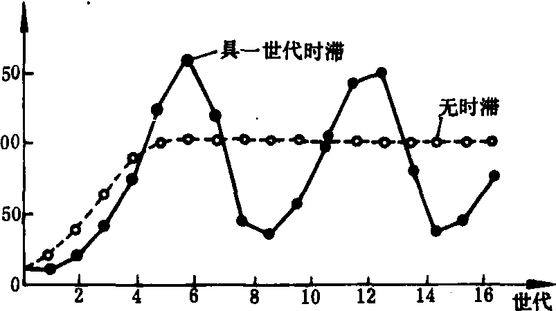 | 释义 | 时滞time-lags不良环境影响种群的效应,推迟出现的时间。在某种环境条件下,生活史较长的昆虫种群,如果幼虫期密度高,个体间对空间和食物的竞争加剧,使死亡率增加; 或由于环境恶化(食物不足,空间拥挤等),使成虫变小,生育力下降,直接影响下一代的增长率; 从种群密度增加、密度制约因素作用加强、到种群表现增长率下降之间,几乎相隔1个世代,即几乎时滞1个世代。图1示世代离散、增长率是密度的线性函数的种群,在有时滞和无时滞情况下的种群动态。在反馈作用下的1个世代时滞,使稳定的种群增长型变成周期性振荡或不稳定,这个种群的增长率在开始时比较慢,在超越平衡点后仍继续增长,然后数量骤然下降,一直降到平衡点之下,形成多少带周期性的振荡。时滞可分作用时滞 (reactivetime lag) 和生殖时滞 (reproductive time lag) 两种。