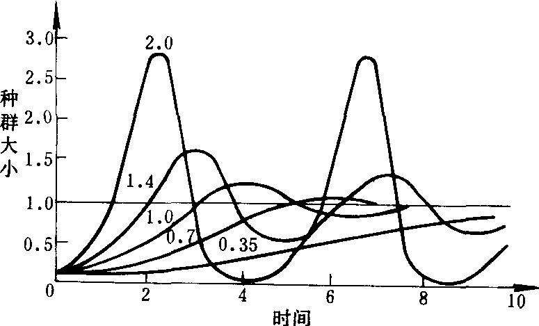 图2 具有不同时滞值的逻辑斯蒂方程所产生的种群增长模型。 曲线上的数字为种群内禀增长率×作用时滞。一般来说,作用时滞愈长,数量更不稳定。 (仿C.J. Krebs) |