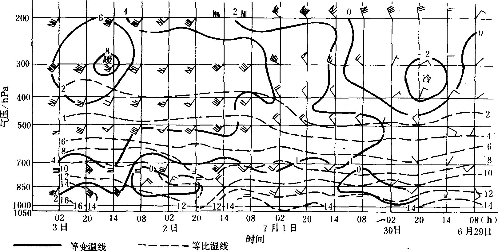 | 释义 | 时间剖面图shijian poumiantutime cross section diag ram表征某一地点上空气象要素值和物理量随时间变化的天气图解,又称时间垂直剖面图。以时间为横坐标,以高度或气压对数尺度为纵坐标,可填写各高度上的气温、露点温度、比湿、位温、假相当位温、垂直速度、风向、风速和天气现象等。可以绘制各种等值线,以分析该地上空大气状况的演变、分析锋区、对流层顶等天气系统经历该地的情况。日常天气分析和研究工作中,经常使用这种天气图,如下图。