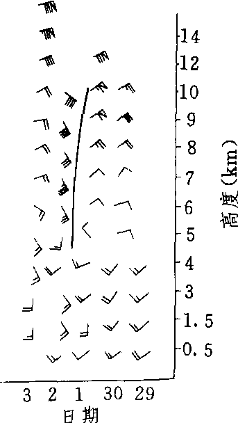 | 释义 | 时间垂直剖面图time vertical cross section chart表达某一测站上空天气和天气系统随时间演变过程的图。常取时间为横坐标,高度或气压的对数值为纵坐标。图中填写某一测站不同时间的各高度上的气象要素和物理量。主要是气温、比湿、位温、风向、风速、散度、涡度等。视研究目的,通常在一张图上选用1~3个要素或物理量,绘制其等值线,即可了解某一测站上空大气状态随时间的变化情况,可分析某一天气系统的高度和经过测站的时间;某一种天气(如降雨、降温)出现前高空温度场、湿度场、风场的变化特点等。附图中填绘的是风向、风速,图中一条竖线为分析出来的东风波位置,表示东风波是在7月1日08时到2日08时之间经过测站的,它的高度位于5~10 km。
