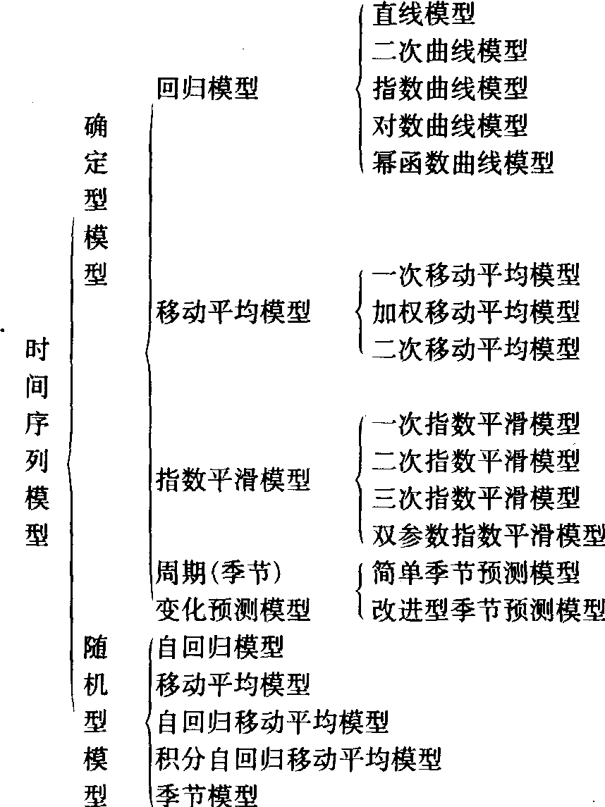 | 释义 | 时间序列模型time series models运用随机过程理论和数理统计方法研究时间序列的数学模型。时间序列是指按时间顺序排列的同一变量的一组观察值。时间序列模型中把时间作为影响研究对象发生变化的各种因素的总代表。根据具体问题用适当的单位(如年、月或小时)计量时间,以t表示。它着重研究数据序列的相互依赖关系。用时间序列模型进行预测,属于历史资料引申性预测,具有所用历史数据较少,易于收集的优点,因而得到广泛应用。常用的时间序列模型见下图。