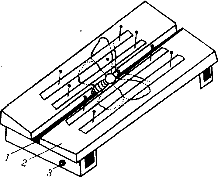 展翅或整姿 为镜检翅脉及胸、腹部的特征,对有翅昆虫(鳞翅目、双翅目等)的标本,除针插外尚需展翅。展翅应在特定的展翅板上进行(图2)。在插入展翅板前,用三级台将标本定位于一定的高度,三级台的下二级用以测定标签高度。展翅时将已针插好的标本,固定在展翅板中央槽内,然后用毛笔或昆虫针按要求将翅拨至适当位置。前翅后缘较直的种类,以伸展到前翅后缘左右成一直线为度; 而前翅后缘成弧形种类,则以后翅前缘左右成一直线为准。通常对蝶蛾类要求左右前翅后缘在一直线上。翅展到所要求位置的同时,用光滑纸条压覆翅上,以大头针固定,并进行整姿。 不需展翅的标本(如甲虫等)应该整姿。整姿有专用的整姿板。将在三级台上定好高度的针插标本插于整姿板,使昆虫腹面正好贴在整姿板上,整姿的主要部位是触角和足。触角短的可伸在头前,或左右分开;触角长的可向后顺在背上。足的整姿原则为: 前足向前(前侧)伸,中、后足均向后(后侧)伸。