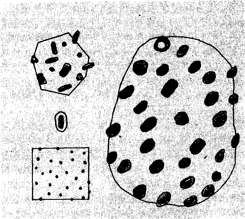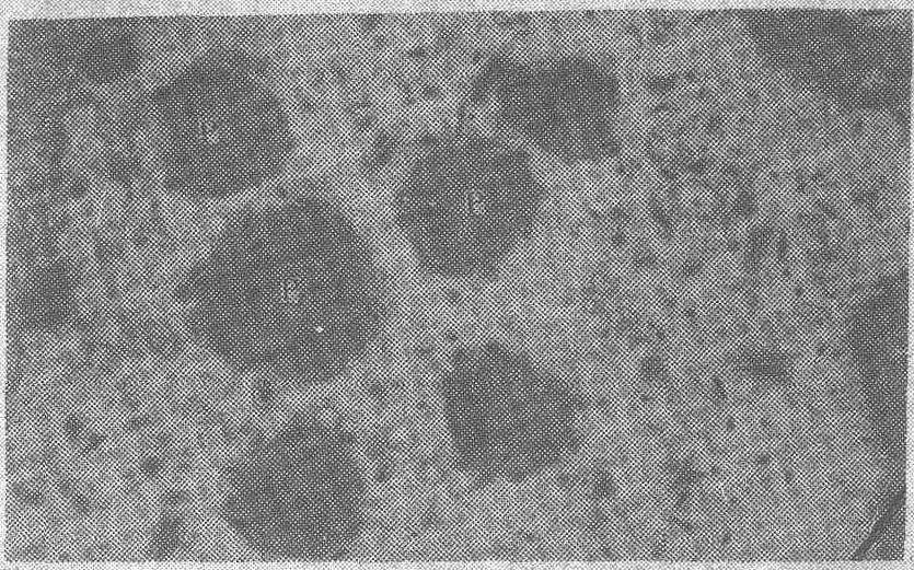 图2 被核多角体病毒(NPV)感染的粘虫(Pseudaletiaseparata)上皮组织的核,可以看见其中的多角体和病毒粒子 (据丁 翠、蔡秀玉,1978) 核内后,核膜破裂、细胞崩溃,多角体又被释放进血腔中。因此感染4天后的体液因充满了多角体而呈乳白色。病虫则出现食欲减退和行动不活泼等症状,移行到植物顶部而停止运动,因体内组织解体,失去握持力,仅以1~2个脚附着在植物上倒挂而死。从感染到死亡的时间,因感染剂量、虫龄大小及环境温度而异,一般3~5天。NPV的宿主特异性较高,只可在不同属间传染,很少在科或目间感染。被NPV感染的包括鳞翅目、膜翅目、双翅目、鞘翅目、直翅目、脉翅目和毛翅目的昆虫。(见彩图46)颗粒体病毒 简称GV。属杆状病毒科B亚属,病毒粒子亦为杆状,在寄主细胞质和核内增殖。其包涵体呈颗粒状,故称为颗粒体。大小约0.5微米。颗粒体内只包含1个或2个病毒粒子。GV的杀虫机制与NPV的十分相似,当GV被昆虫吞食后,在中肠肠腔内被溶解并释放出大量病毒粒子,病毒粒子在中肠细胞核内不仅复制新的子代病毒,而且还能形成一部分颗粒体,新生病毒穿出中肠细胞进入血腔,在血腔内感染其他敏感组织(图3)。与NPV不同的是它可同时在细胞质内及核内复制病毒并增殖大量GV。GV的组织感染范围不如NPV广泛,仅包括脂肪、气管皮膜、血细胞及上皮等,偶尔还感染马氏管。濒危幼虫表现行动迟缓、体节肿胀、体色乳白等典型症状,感染后4~7天死亡,死后体表较坚硬,不像NPV那样易碎。它的寄主专化性比NPV强,交叉感染只发生在不同的种间,寄主范围也只限于鳞翅目昆虫内。 质多角体病毒 简称CPV。属呼肠孤病毒科,在寄主细胞质内复制。包涵体的形状不一,以立方体和六面体居多(图4),大小在1~4微米之间,呈20面