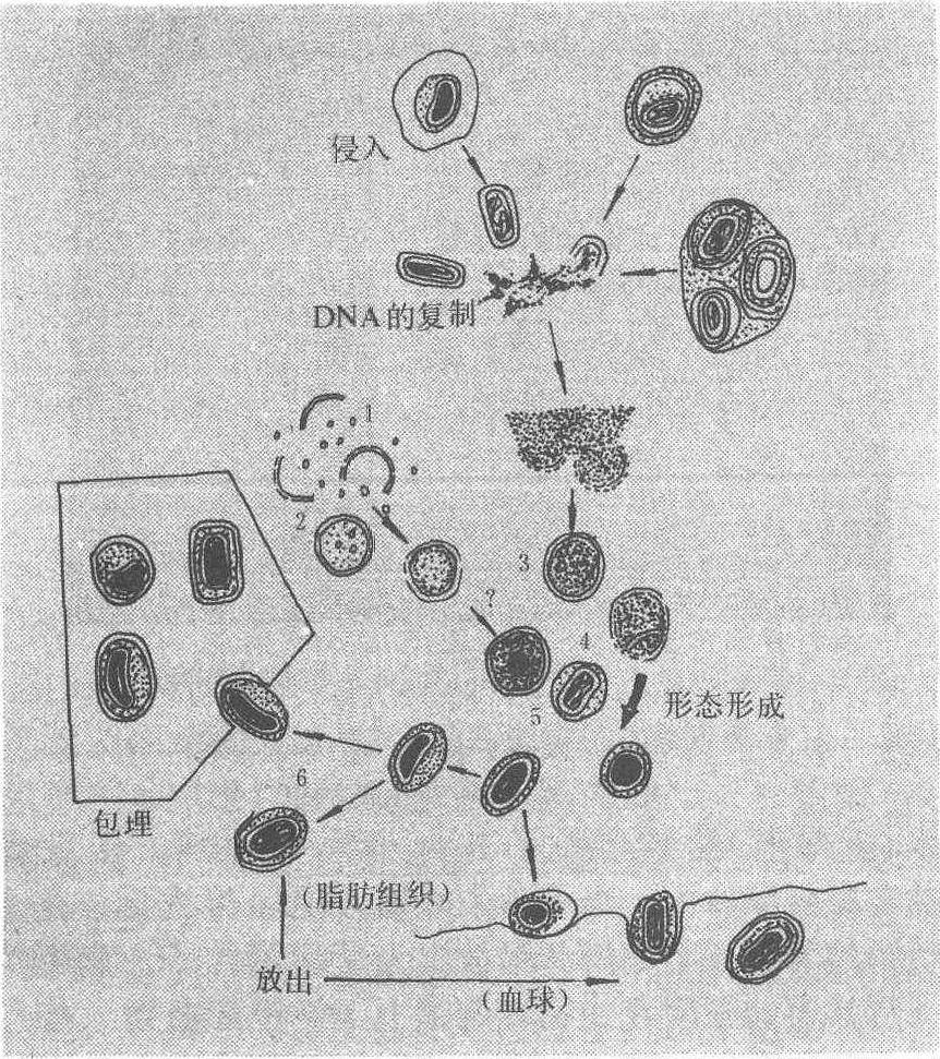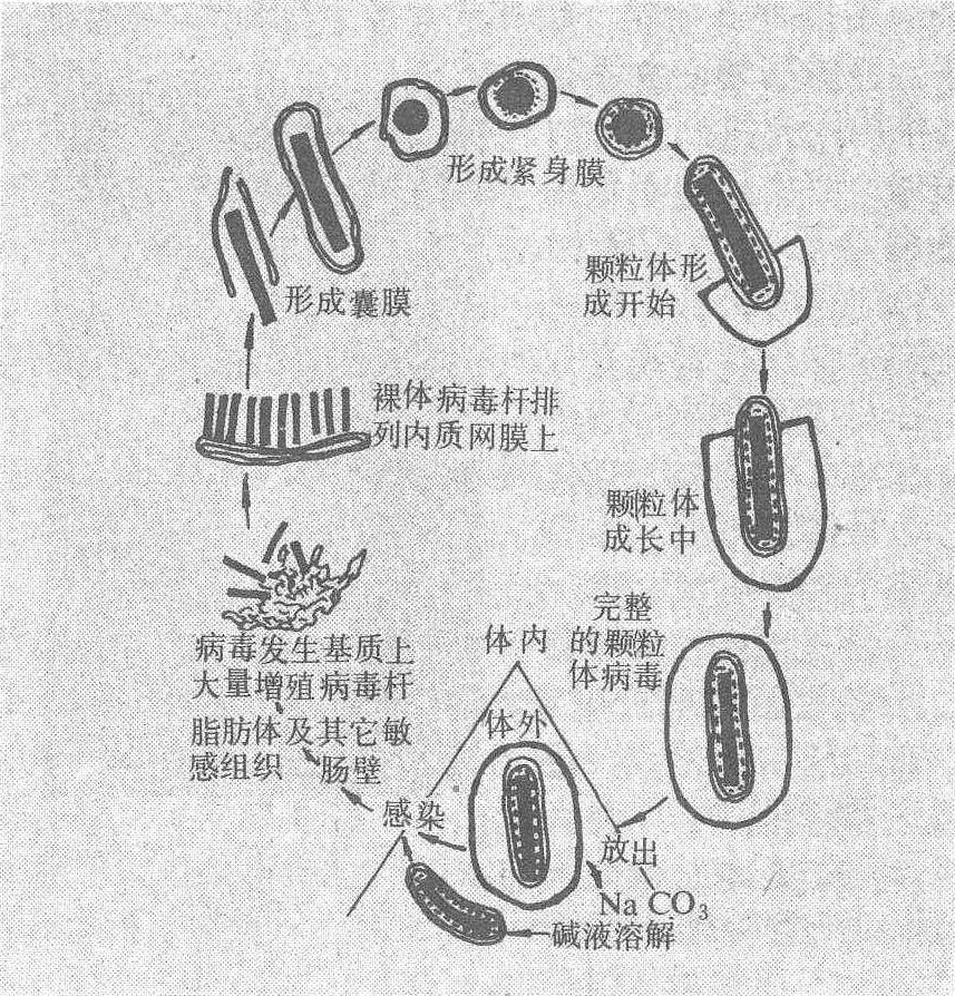 图6 五月金龟甲痘病毒(EV)在血球和脂肪细胞内增殖 (据G.Devauchelle等,1971) 感染时,痘病毒的球状体或椭圆体被宿主消化道的碱性消化液溶解,释放出带囊膜的病毒粒子,病毒粒子囊膜与中肠细胞的微绒毛融合,进入中肠细胞质内复制子代病毒; 如将病毒粒子直接注射到血腔内,被吞噬细胞摄入液泡之中,当其囊膜和液泡膜破裂时,将核衣壳释放在血细胞的细胞质内进行复制。两种侵入的方法不同,但在敏感细胞内增殖机理与其他病毒类似,在病毒发生基质处开始子代病毒的复制和装配,成熟的子代病毒粒子向细胞质膜处移动,通过芽出方式获得囊膜并释放到细胞外面,继续感染其他细胞,或被包埋进蛋白质晶体内形成球状包涵体(图6),由于球状体数量的不断增加,胀破细胞质膜,使细胞完全崩坏,最终导致寄主死亡。寄主被痘病毒感染后的外部症状表现为: 体色逐渐变乳白色,活动能力减退,致病至死亡需要6~20天或更长。除幼虫外,蛹和成虫都能感染。痘病毒对寄主具有较强的特异性,能感染鞘翅目、双翅目、鳞翅目及直翅目的昆虫。 |