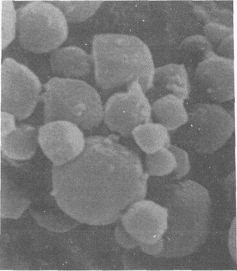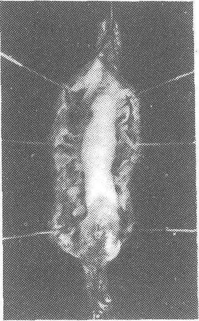 图4 黄地老虎(Agrotis segetum)质多角体病毒(CPV) 多角体的扫描电镜图,多角体近似球状 (据丁 翠、蔡秀玉,1980) 体(近球形)的病毒粒子其大小为70纳米,任意地散布在包涵体内。当多角体被摄入昆虫体内后,在中肠肠液的作用下溶解并释放出大量病毒粒子。病毒粒子用其突起吸附在中肠细胞膜上,将核蛋白射入细胞质内,合成自身核酸和蛋白,并装配成子代病毒粒子,众多的病毒粒子被包埋在蛋白质晶体内形成多角体。中肠由柱状、杯状和再生细胞组成,它们被CPV感染的顺序是先柱状、后杯状,再生细胞偶尔也被感染。感染后期,由于这些细胞内充满白色的多角体,使中肠由正常绿色变为乳白色(图5),中肠细胞的正常代谢机能完全破坏,无法合成生长发育所需要的营养,此时幼虫出现食欲减退、行动呆滞、下泄、体型变小等典型症状,最后,完全停止生长直至死亡。致死时间比NPV的长,约7~20天,但它表现明显的后效作用。有些感病而未死的幼虫,仍能化蛹、羽化,并产生下代幼虫,因母体携带病毒,子代幼虫