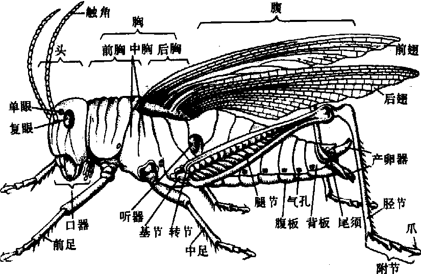 棉 蝗 外 形 头部体节完全愈合,有复眼、单眼和1对触角。触角的形状差异很大,往往随种类和雌雄性别而不同。口器是昆虫的摄食器官,基本上由上唇、下唇、大颚、小颚和舌5部分构成。由于动物的食性和摄食方式不同而有种种变化: 如咀嚼式口器(蝗虫、蜚蠊)、刺吸式口器(蚊、蝉)、嚼吸式口器(蜜蜂)、舐吸式口器(蝇)、虹吸式口器(蛾、蝶)等。 胸部分为前胸、中胸和后胸三体节,每一胸节有足1对,由于各种昆虫的生活方式不同,足的形态产生了许多适应性变化,如蝗虫的跳跃足,蜚蠊的步行足、螳螂的捕捉足、龙虱的游泳足、蝼蛄的开掘足、蜜蜂的携粉足、头虱的攀缘足等。大多数成虫有翅2对,分别位于中胸和后胸的背侧。昆虫的翅也因种类的不同而有变化,如膜翅(蜜蜂)、鞘翅(金龟子)、半鞘翅(椿象)、复翅(蝗虫)、鳞翅(蛾、蝶)等,家蝇的后翅非常退化而变为平衡棒。 腹部体节数最多不超过12节,一般为11节,但也有3~4节(青蜂)或5~6节(蝇)的。成虫除尾须和雌、雄外生殖器外,附肢均已消失。 体壁的外表为外骨骼,其最外为蜡质层,有不透水的作用; 内层为几丁质层含有骨蛋白,因而质地坚硬。体壁外表有刺、棘、毛、鳞片等突起物。 消化管分前肠、中肠和后肠。前、后肠来自外胚层,由体壁内陷而成,其内壁有几丁质表皮层,蜕皮时也随之脱落。中肠来自内胚层,形成胃,无几丁质表皮层,前端有突出的胃盲囊。消化管的形态和区分,在不同种类中,随食物种类及食物利用的程度而有所不同。 排泄器官为开口于中、后肠交界处的马氏管。呼吸器官为气门和气管,气门位于虫体两侧,与体内主气管相通连,气管在体内多次分枝,分布到达全身,组织细胞可直接与空气进行气体交换。水生的昆虫还有气管鳃。 循环系统为开管式,位于消化管的背面有背血管,分为心脏和大动脉两部分。真体腔退化,形成血腔(血窦),血液大部分在血腔中流动。 神经系统为链状。感觉器官发达,有各种感受触觉、味觉、嗅觉、视觉、听觉等的感受器。 雌雄异体,有多种生殖方式和强大的繁殖力。发育过程中,分无变态和有变态两大类,后者又分渐变态、半变态和完全变态。 分类及重要种类 一般分2亚纲、33目。 无翅亚纲(Apterygota) 较为原始的昆虫,体较小,原始无翅,腹部具有附肢的遗迹,发育无变态。种类不多,包括缨尾目(Thysanura),弹尾目(Collem-bola),原尾目(Protura),双尾目(Diplura)。 有翅亚纲(Pterygota) 较高等的昆虫,大都有翅,有些种类的翅退化消失而成为无翅,成虫腹部无运动器,发育时有变态。种类很多,绝大多数昆虫均属于本亚纲,包括29个目,主要有: ❶蜉蝣目(Ephemerida),如蜉蝣; ❷蜻蜓目(Odonata),如蜻蜓,豆娘; ❸蜚蠊目(Blattaria),如蜚蠊; ❹螳螂目(Mantodea),如螳螂; ❺直翅目(Orthoptera) ,如东亚飞蝗、蟋蟀、蝼蛄等; ❻等翅目(Isoptera),如家白蚁; ❼虱目(Anoplura),如体虱、猪虱; ❽半翅目(Hemiptera),如椿象、臭虫等; ❾同翅亚目(Homcp-tera),如蝉、蚜虫、介壳虫等; ❿脉翅目(Neuroptera),如草蜻蛉、白蜡虫、紫胶虫等;(11)鳞翅目(Lepidoptera),如凤蝶、白粉蝶、二化螟、天蛾、家蚕、柞蚕等;(12)鞘翅目(Coleptera),如龙虱、瓢虫、芫菁、天牛、象鼻虫、金龟子等;(13)膜翅目(Hymenoptera),如叶蜂、胡蜂、蚁、姬蜂、赤眼蜂、蜜蜂等;(14)双翅目(Diptera),如蚊、蚋、食蚜蝇、家蝇等;(15)蚤目(Siphonaptera),如人蚤、鼠蚤等。 重要种类有: 七星瓢虫(Coccinella septempunc-tata) 属鞘翅目。体卵圆形拱起,背面光滑无毛。头部黑色,刻点均匀细小。复眼黑色椭圆形。触角11节有细毛。前胸背板前缘内凹。鞘翅红色或橙黄色,上有七个黑点。中胸腹板拱起,足黑色。以各种蚜虫如豆蚜、桃蚜、槐蚜等为食。在中国分布于北京、河北、河南、山东、山西、新疆、江苏、江西、湖南、浙江、福建、云南、四川。印度也有分布。 中华蜜蜂(Apis cerana)属膜翅目。雌性头部前端窄小; 唇基中央稍隆起,上唇长方形; 上颚顶端有三角形斑,触角柄节及小盾片黄色; 足及腹部3~4节红黄色,体被浅黄色毛。分布中国各地。 三化螟(Tryporyza incertulas) 属鳞翅目。雌蛾前翅黄色,后翅白色,外缘黄色,腹部末端有成束的黄褐色鳞毛。雄蛾的头、胸及前翅灰褐色,翅顶到后缘有一条黑褐色斜线,外缘有8~9个黑点,后翅白色。主要分布在东南亚。在中国见于江苏、浙江、湖南、安徽、江西、湖北、河南、陕西、四川、贵州、福建、台湾、广东、广西、云南等省区,危害水稻。 菜粉蝶(Pieris rapae)属鳞翅目,体黑色,头、胸部有白色的绒毛,翅和脉纹白色,翅基部和前翅前缘色暗,雌蝶明显,前翅顶角和中央有2黑斑,后翅前缘1黑斑。主要危害十字花科、及豆科、蔷薇科植物。分布于中国北方及南方部分省区。 恒春新白蚁(Neotermes koshunensis) 属等翅目。有翅成虫的头方圆形。前唇基短宽梯形,后唇基与头部分界不明显。单眼大,复眼圆形。触角16~19节。前胸背板宽大于头。雄性腹部末端有腹刺。头部桔红色,胸、腹部橙黄色。群居于木屋内穿筑燧道以木屑为食。分布于中国台湾、福建、广东、海南、云南等省。危害木材及木结构的建筑物。 生态 昆虫能高度适应环境。表现随环境而变化的保护色,如蝗虫在农作物上为绿色,枯草上为黄色。另一些昆虫休息时形态与环境相似,如竹节虫、木叶蝶酷似植物枝叶,称为拟态。有色彩鲜艳使敌害不敢接近的警戒色,如凤蝶类等昆虫的生活范围广泛,