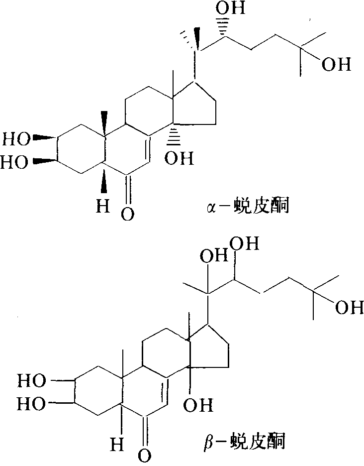 简史 1922年,波兰学者用结扎实验证明,舞毒蛾幼虫脑产生激素,能控制幼虫化蛹。1940年,日本福田宗一报道,前胸腺是控制家蚕变态的内分泌中心。1954年,德国的布特南特(A.Butenandt)和卡尔松(P.Karlson)从蚕蛹中分离出有蜕皮活性的粗结晶物——α-蜕皮酮(α-Ecdysone)。1956年,卡尔松等人从海螯虾中分离出β-蜕皮酮(β-tecdysone)。1966年,日本的中西香尔从台湾植物百日青(Podocarpus nakaii)中分离出有蜕皮活性的百日青甾酮(ponasterone A),竹本常松等人从一种牛膝属植物中分离出牛膝甾酮(inokosterone)。现在发现含蜕皮激素的植物达1000多种,从中分离出40多种有蜕皮活性的甾族化合物,统称为植物源蜕皮激素。有的植物含蜕皮激素的量高达1%。1969年,日本人发现将蜕皮激素加到5龄家蚕饲料中,食后约24小时一齐变成成熟蚕,为蜕皮激素在养蚕业上找到了用途。中国从1973年开始从植物中提取蜕皮激素,用作蚕的增丝剂。