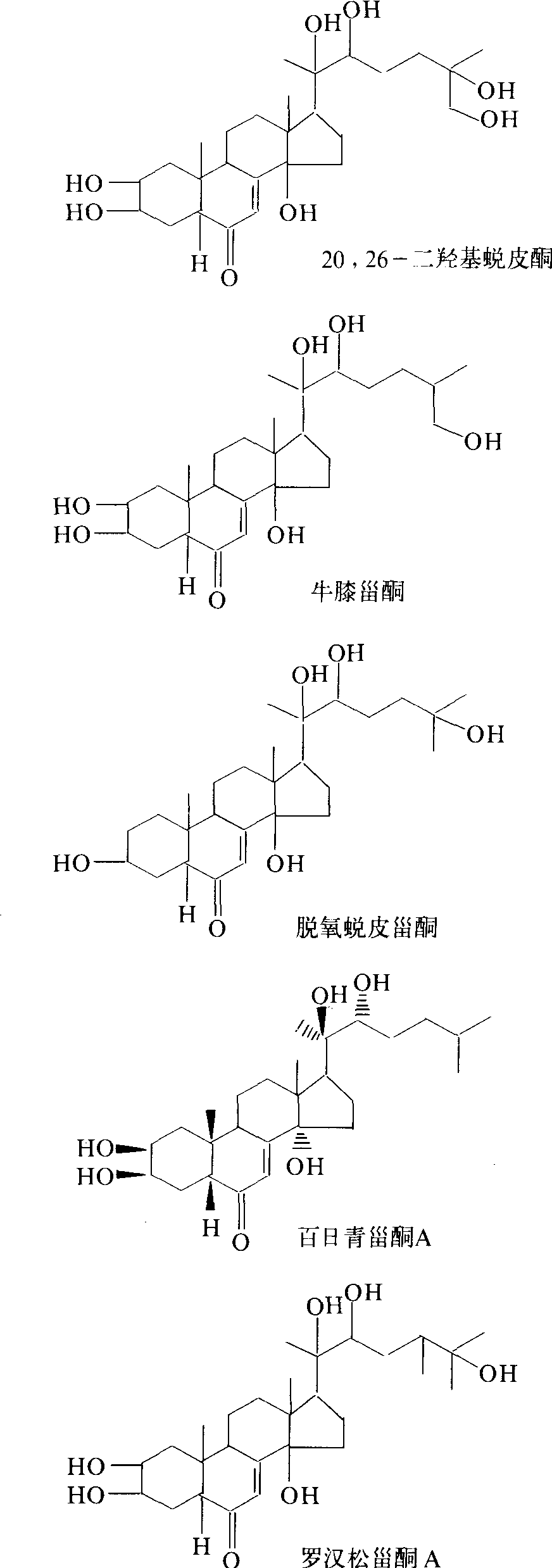 品种类型 从来源上可分为动物源蜕皮激素和植物源蜕皮激素两类。有的蜕皮激素动、植物体内都有,均为甾酮类化合物,大多含有2β,3β,14α- 三羟基-7-烯-6-甾酮基团,只是支链上有差别。α-蜕皮酮主要从家蚕、柞蚕等昆虫中分离出来。β-蜕皮酮存在于昆虫体内、海虾等甲壳动物及许多植物中。植物蜕皮激素中比较重要的有百日青甾酮A、牛膝甾酮、罗汉松甾酮A。较为重要的蜕皮激素的化学结构如下: